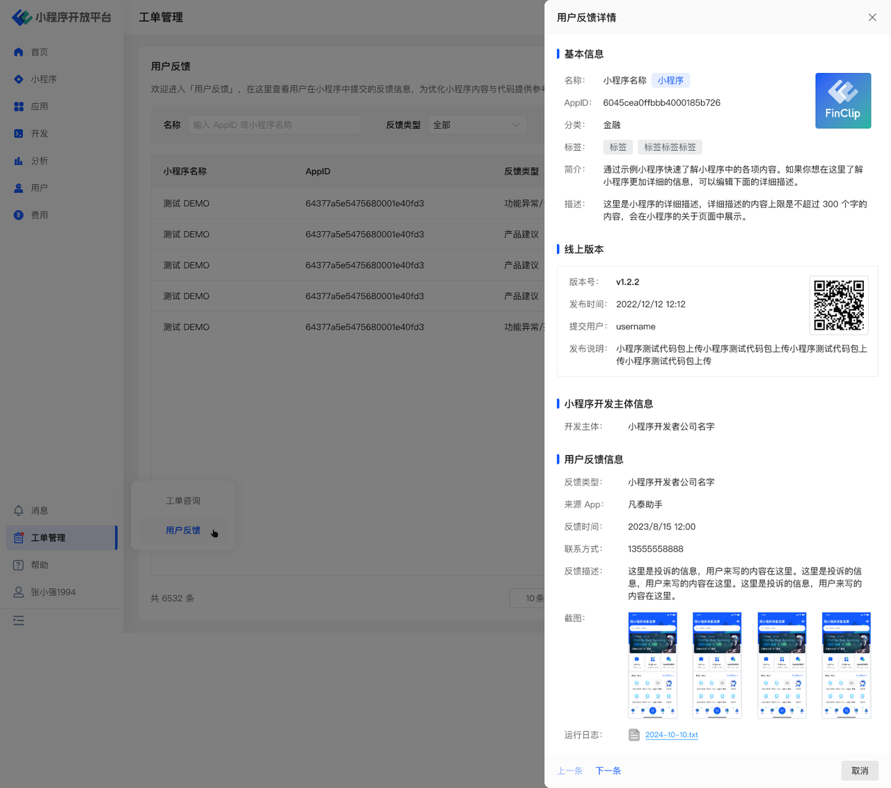 在此处您可以查看该小程序的基本信息以及用户反馈的详情,若为功能异常的反馈,则可以下载运行日志进行查看,方便您快速定位问题。