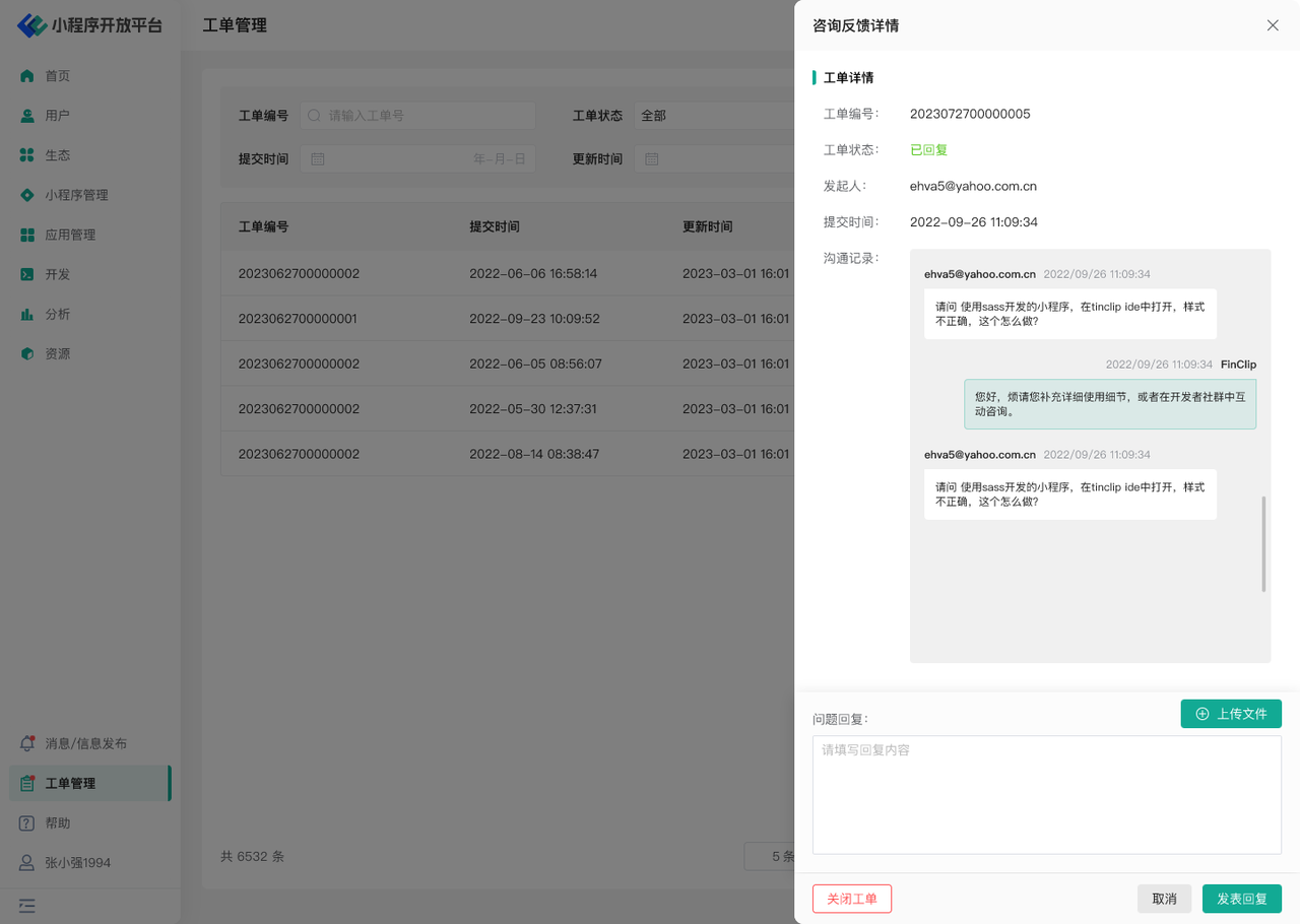 在工单列表页点击查看详情,可查看对应的工单提交信息、回复信息,在对话框内可进行工单的回复或补充,您也可以上传额外的附件资料补充说明。若您觉得该问题属于无效问题或已解决该工单,可点击「关闭工单」。