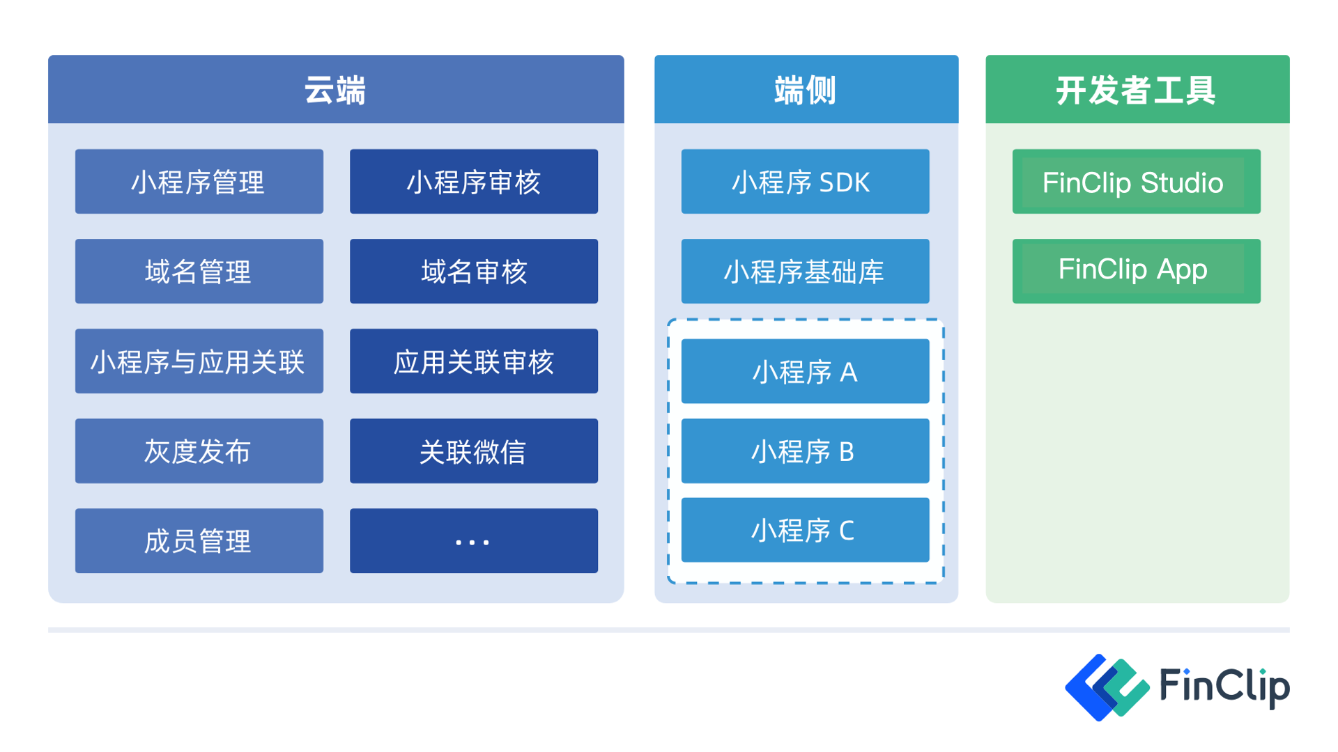 FinClip 分别由云侧,端侧与开发者工具三部分组成: