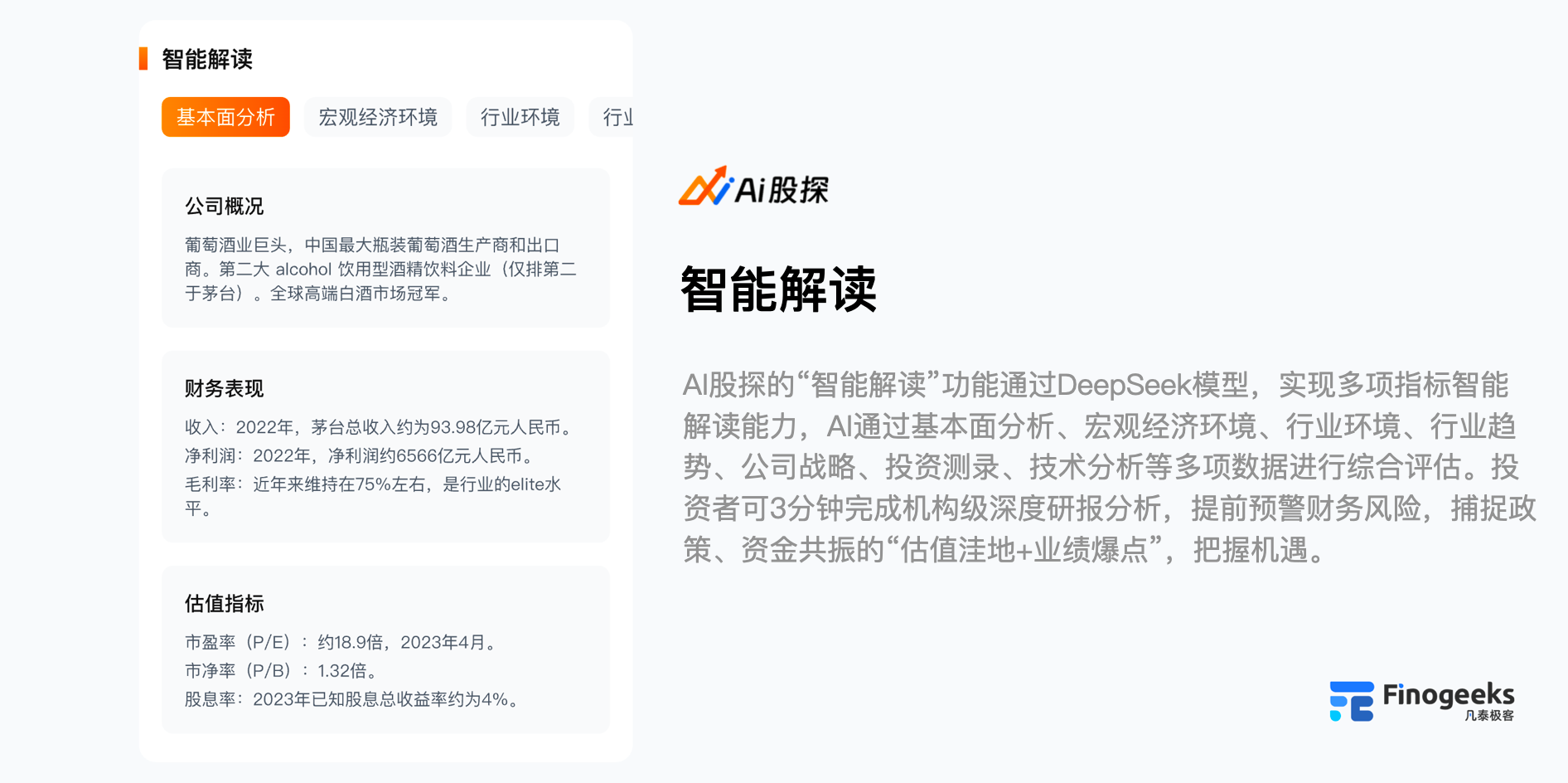 - 盈利能力解读:AI 会像“老中医”一样从盈利能力、营运能力、偿债能力、现金流、成长能力与估值水平等财务盈利角度进行望闻问切,帮助用户进一步“注意盈利能力”信息。