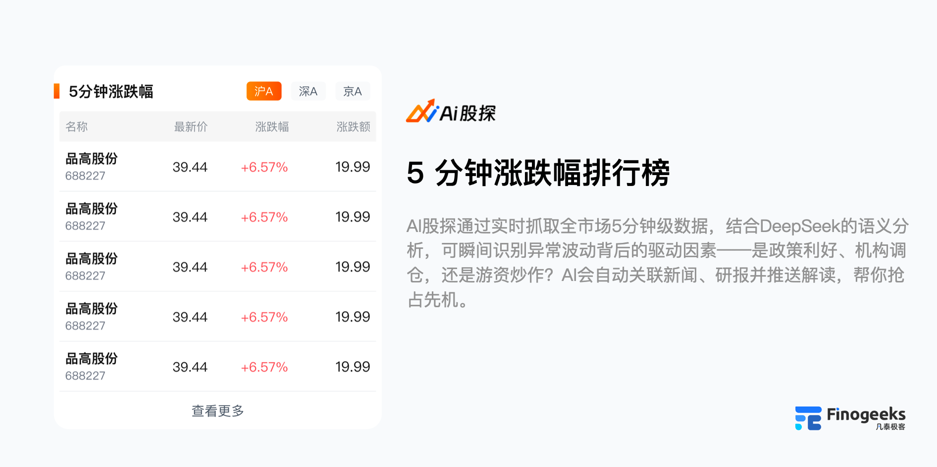 投资者可以通过「AI 股探」中的「5 分钟涨跌幅排行榜」快捷了解当前市场动向,掌握投资先机。