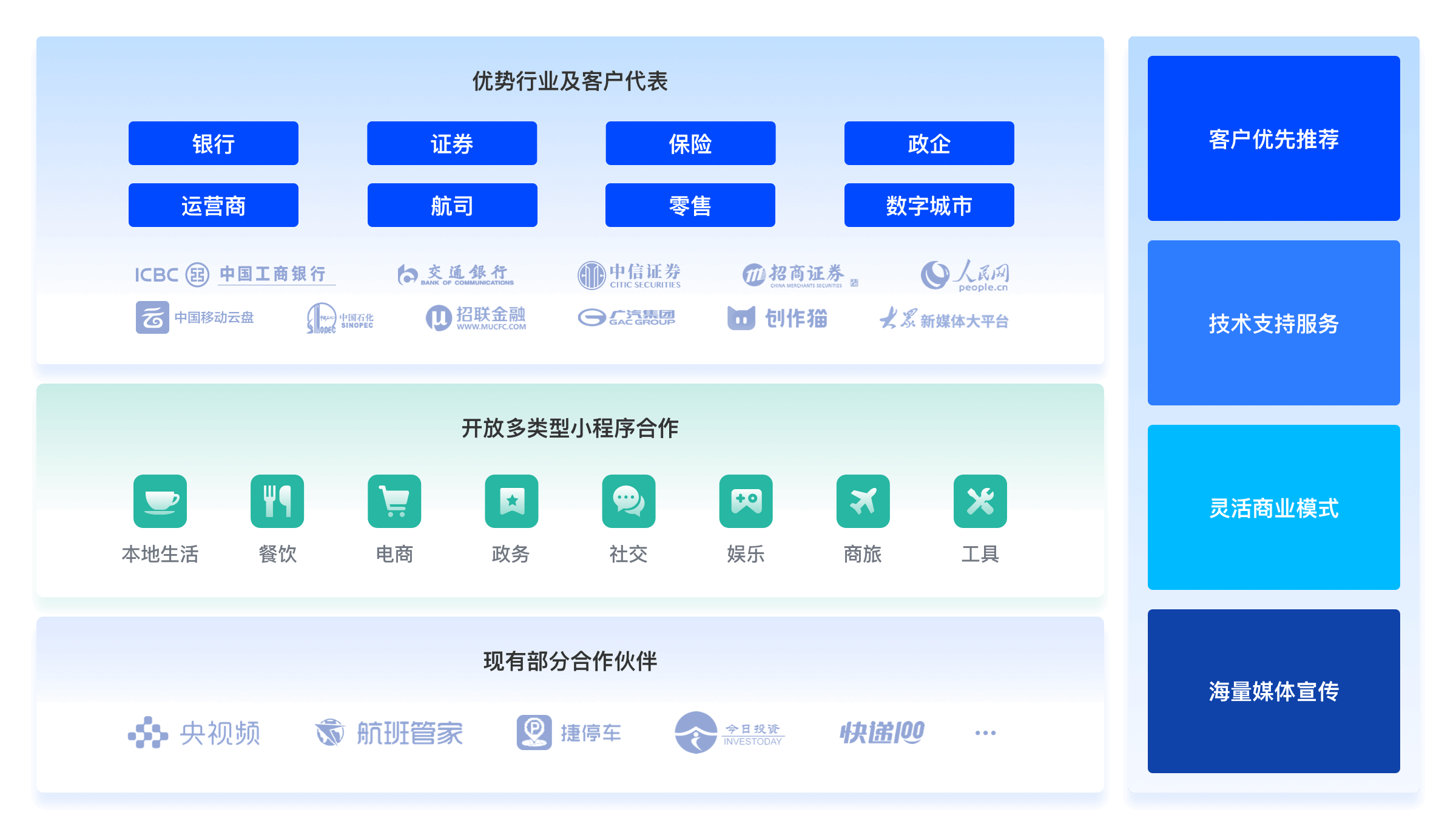 作为国内领先的小程序容器技术,致力于服务客户快速打造超级App,同时为生态伙伴提供低成本、高效的业务拓宽,灵活的商务模式,支持多样化的商业化合作。