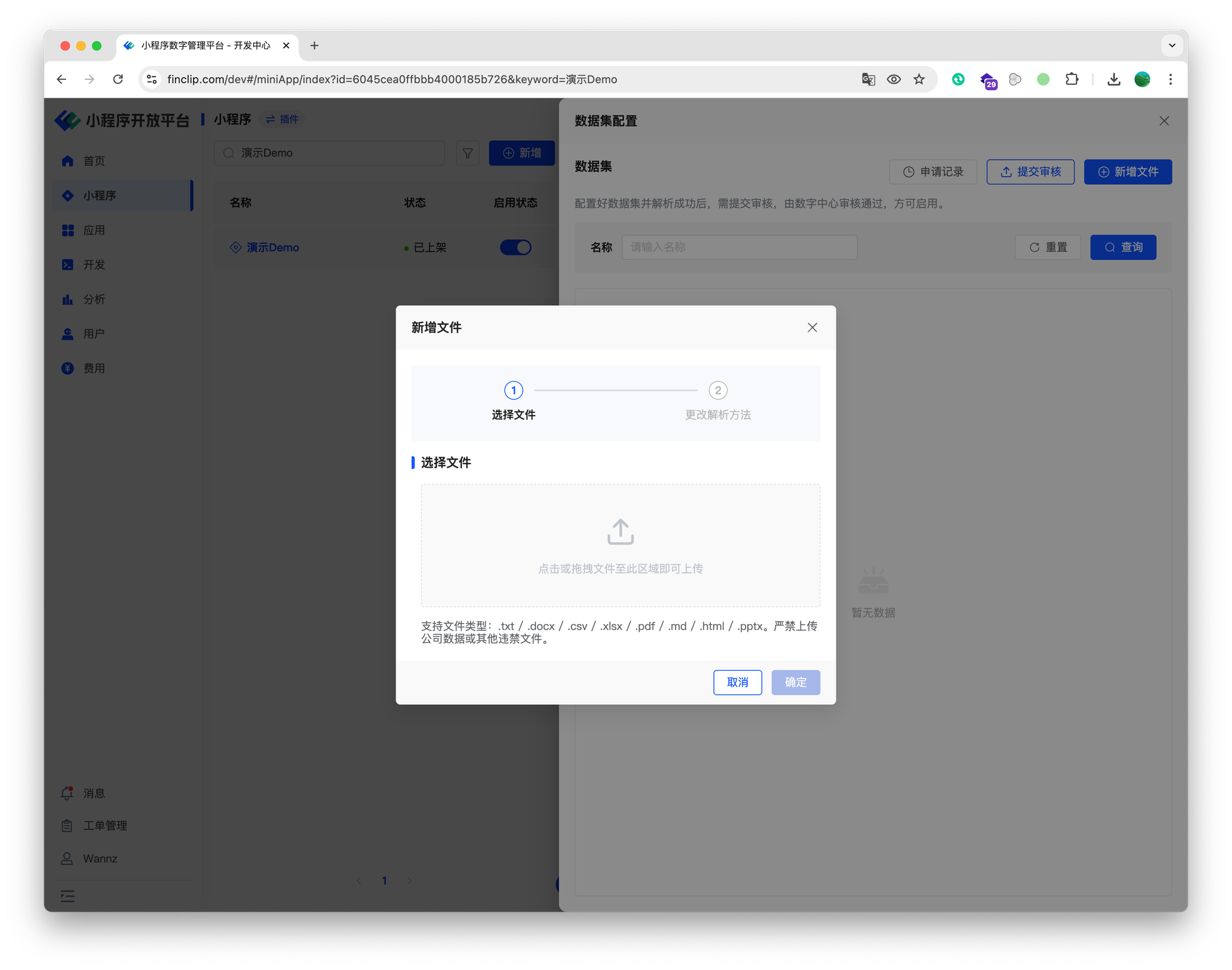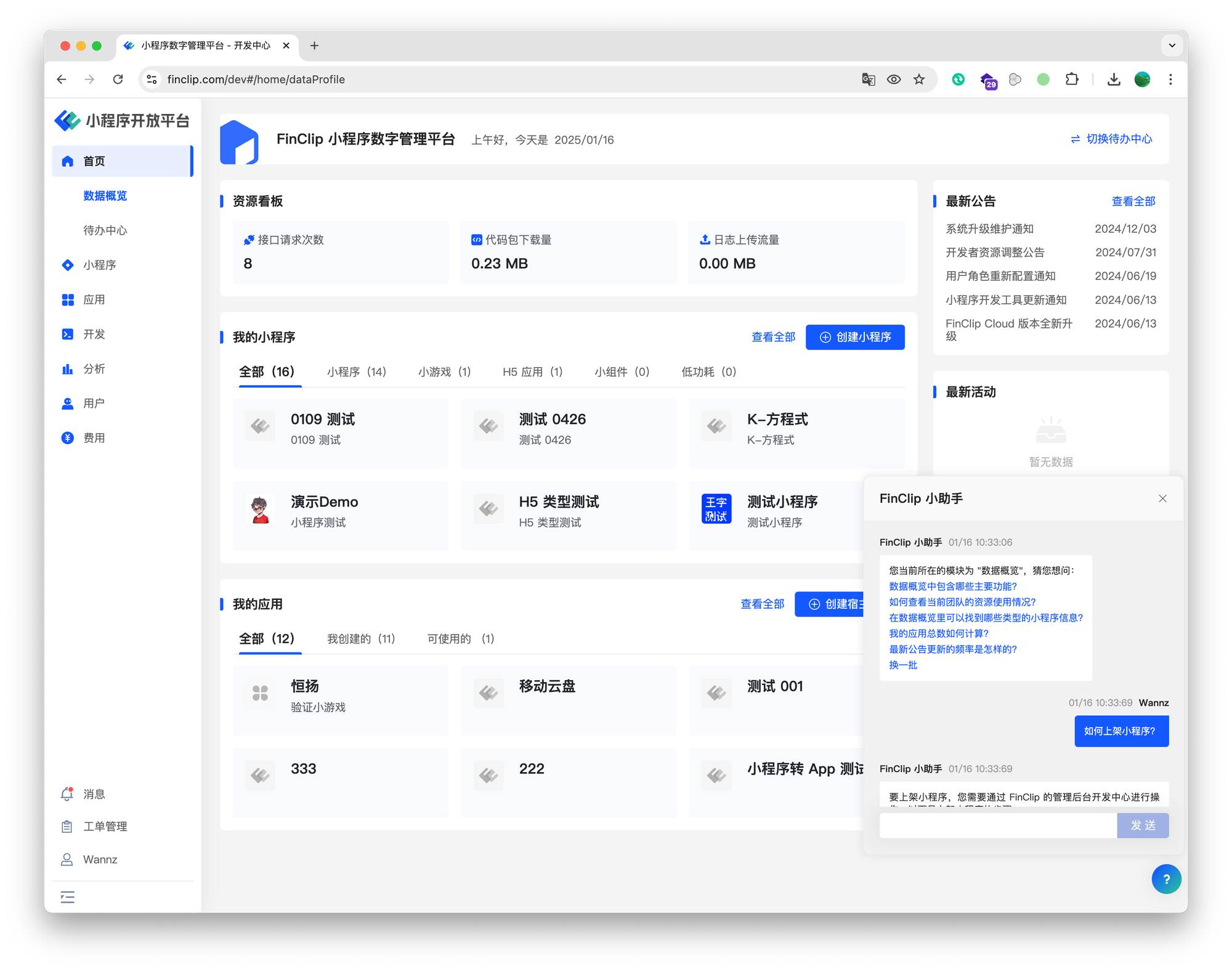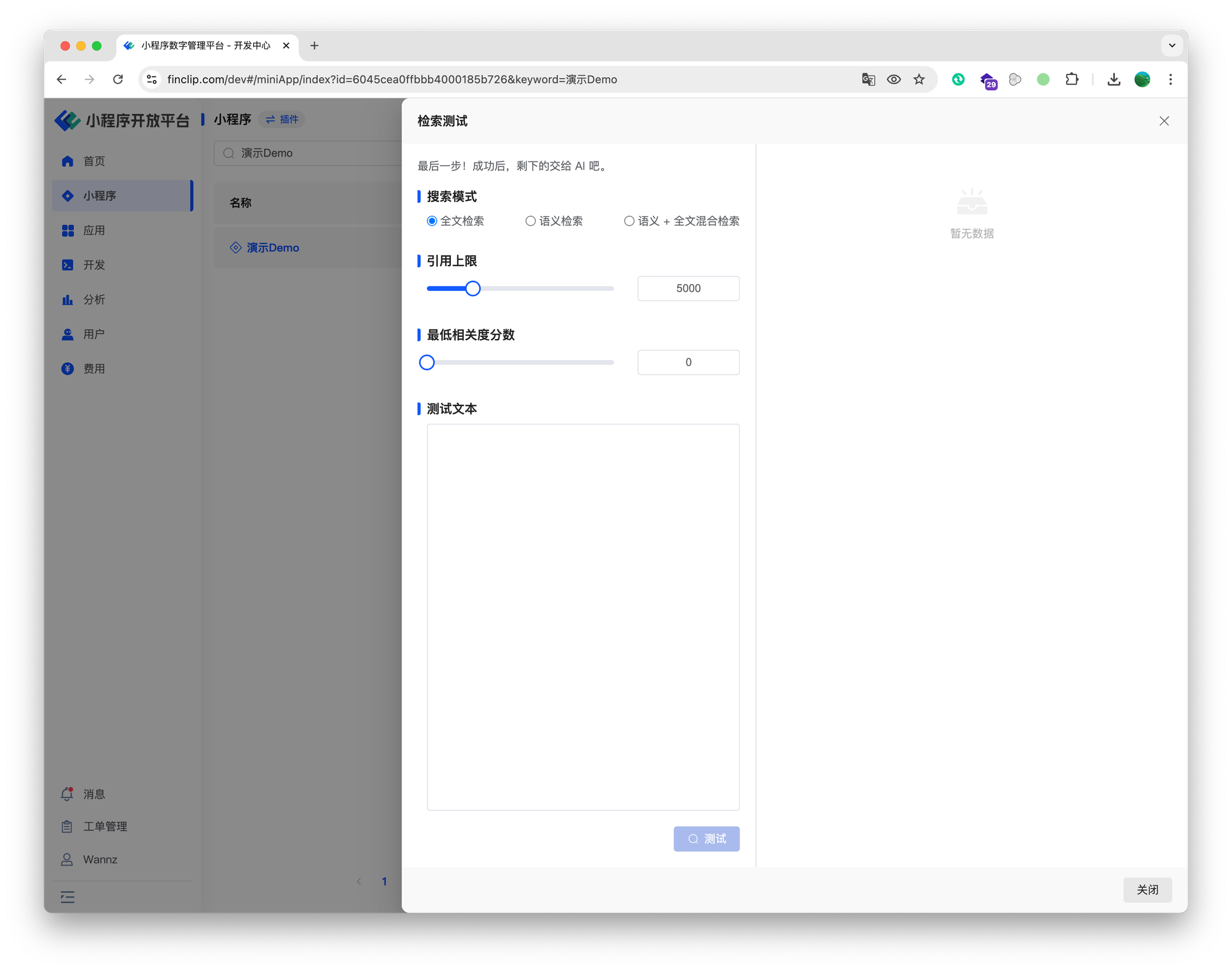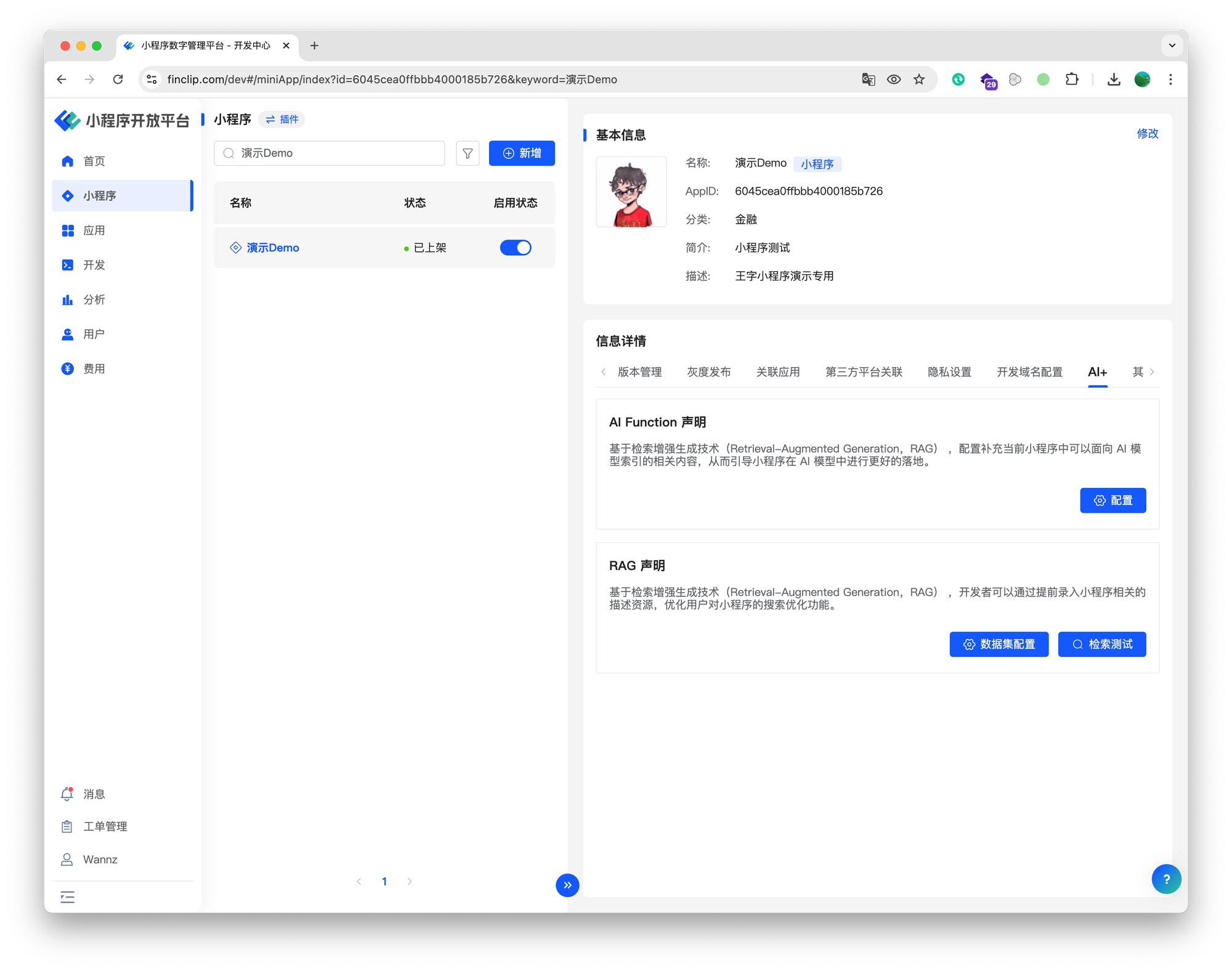 当用户在管理后台操作时,遇到任何关于 FinClip 的使用、配置或开发问题,只需点击聊天框,即可呼出 AI 助手。无论是技术难题还是操作指引,AI 助手都能迅速给出专业的解答,大大提升了用户解决问题的效率。