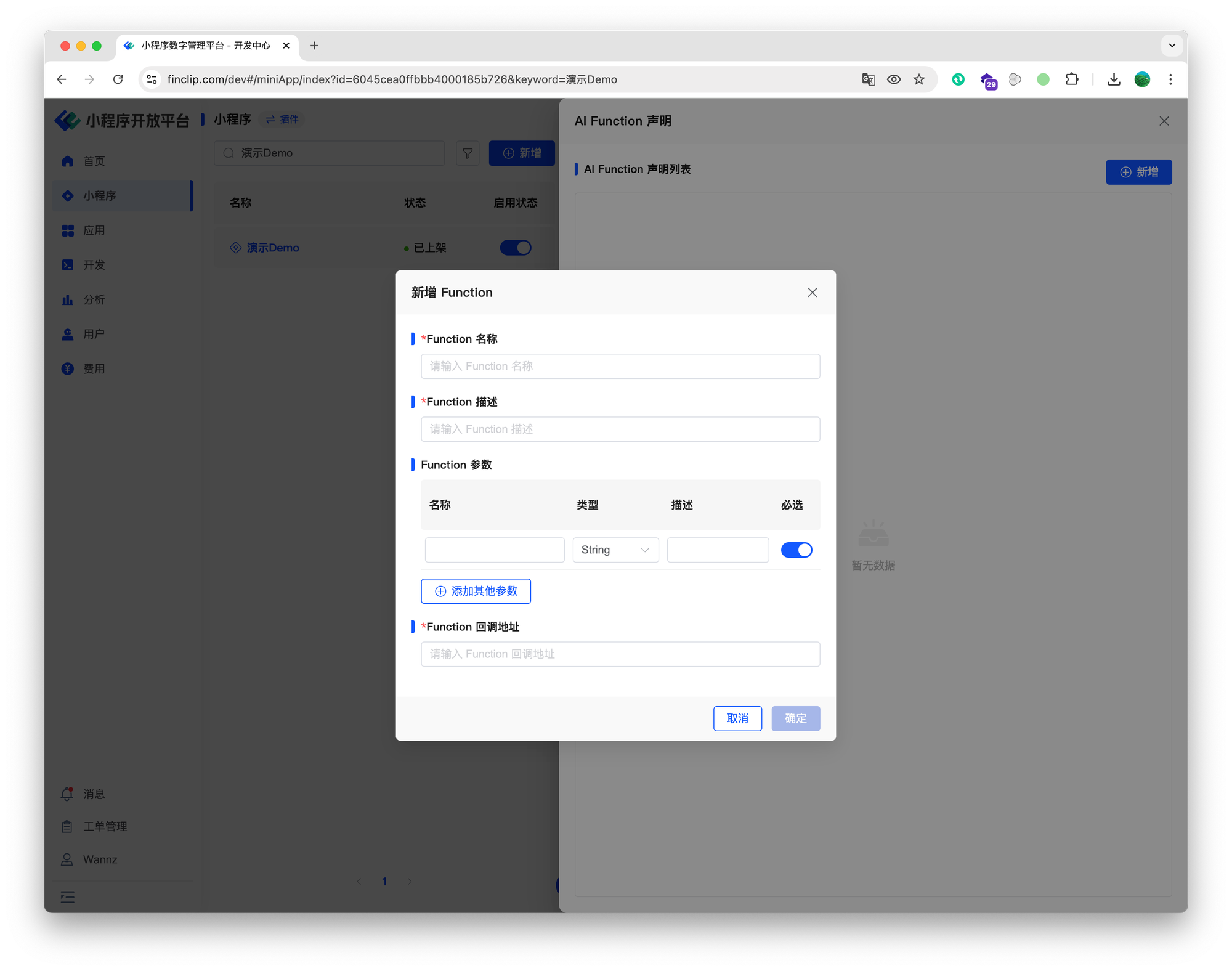 在这里需要补充解释一下,在这里 FinClip 主要是提供了一个入口,能够让开发者自行录入这些 AI Function。但这些工具的具体功能,比如查询订货单、确认包裹位置等功能,则需要开发者自己去实现。开发者可以在自己的后端服务中编写代码,实现这些功能,并通过回调地址将结果返回给 FinClip。