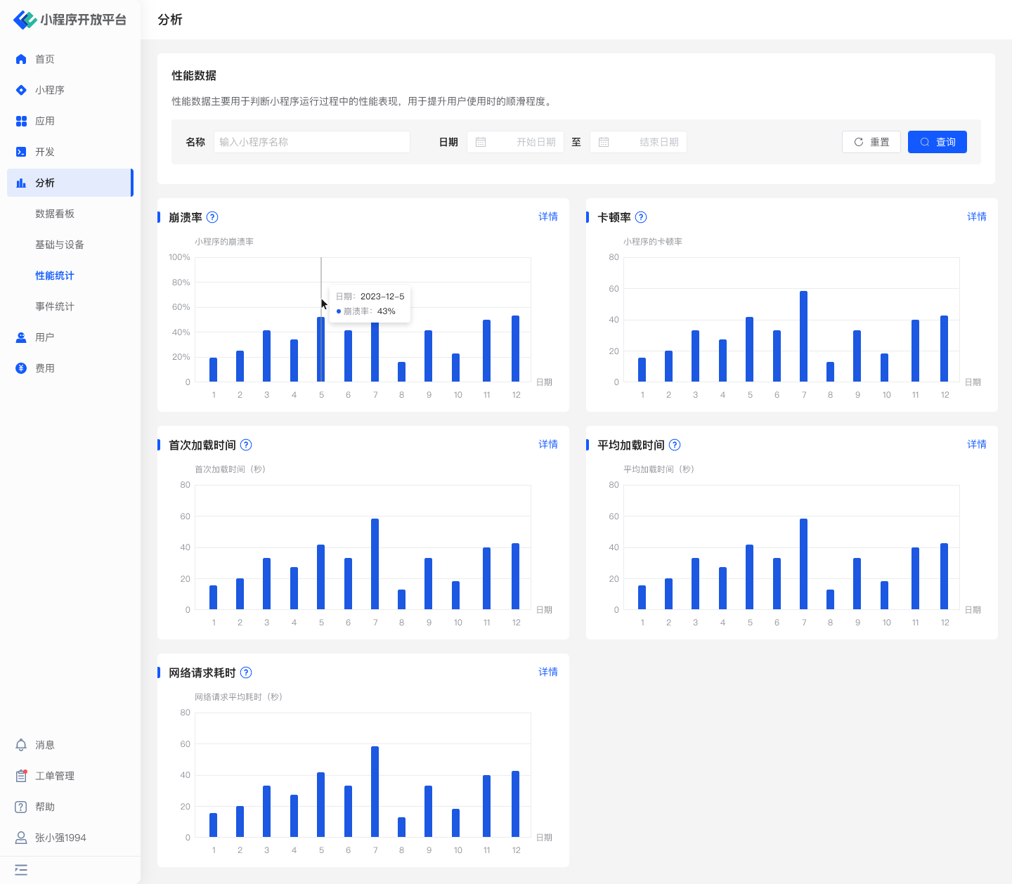 为了确保小程序的流畅运行,FinClip Cloud 的新版本还增加了对小程序性能的监控功能,包括:崩溃率查询、卡顿率查询、小程序加载时间查询、网络请求耗时查询。