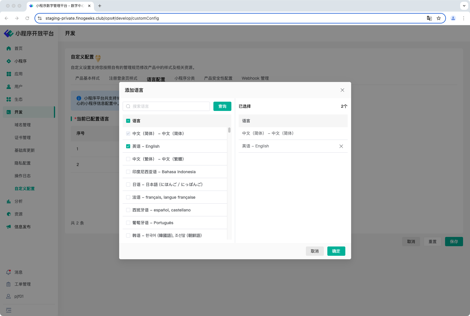 FinClip 数字中心在语言配置方面迈出了重要的一步,现在支持用户自行添加语言选项。这一更新意味着开发者和企业可以根据自己的全球市场战略,轻松地将小程序本地化为多种语言,从而更好地服务于不同地区的用户群体。