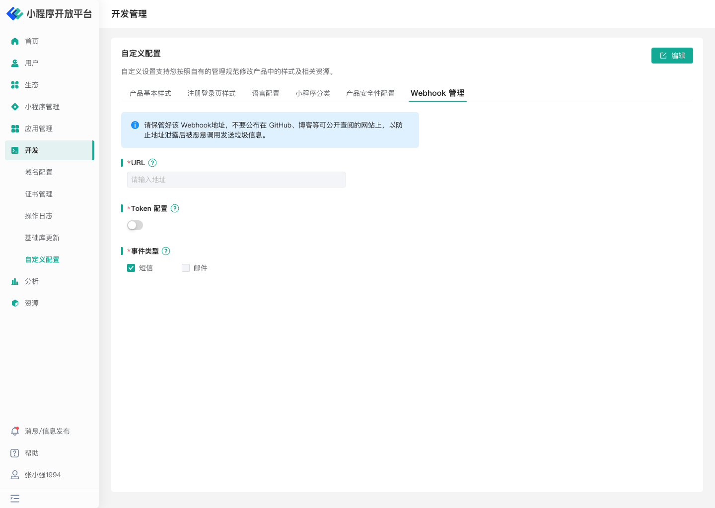 FinClip 数字中心增加「Webhook 管理」功能。现在,用户可以轻松地将 FinClip 平台与自己的短信或邮件系统集成,实现无缝的数据交互和操作自动化。通过配置 Webhook,每当 FinClip 数字中心检测到特定事件或行为时,就会自动触发预设的外部系统动作,如发送短信通知或电子邮件。