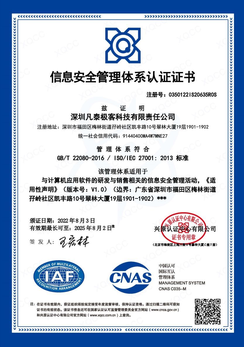 按照 ISO 27001:2013 的各项标准,我们建立了信息安全管理体且通过了认证机关的审核,在 2022年通过了认证机关的审核,并于 2022 年 8 月取得了证书。