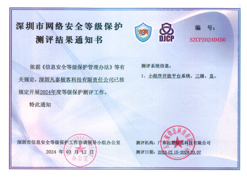 按照 信息安全等级保护管理办法 等相关规定,我们对 FinClip 的整个系统进行了专门的安全加固,在 2020 年首次通过了认证机关的审核,并取得了证书。