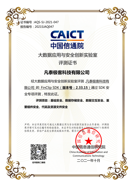 我们已经于 2021 年通过了中国信息通信研究院颁发的的审核,并于 2021 年 10 月取得了证书。