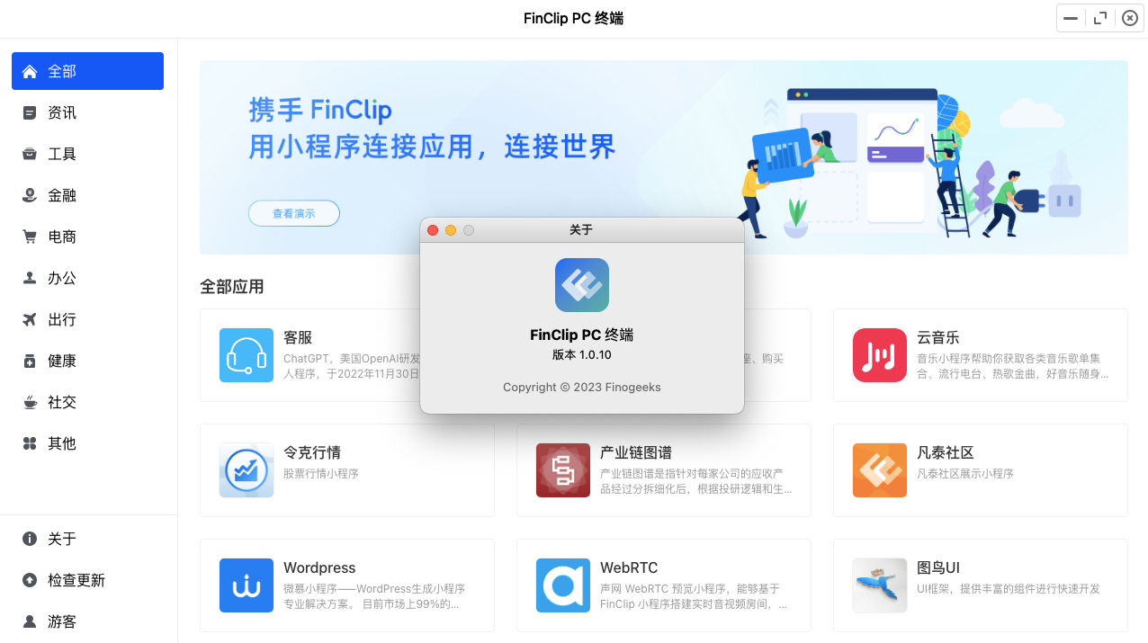 Fincp PC终端现已支持查看当前版本(入口:Finclip PC终端首页-关于)