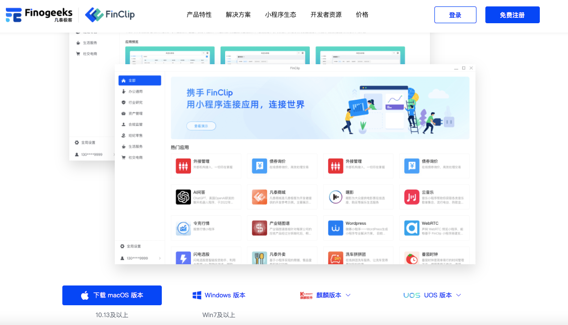 官网新增Finclip PC终端麒麟版、UOS版下载入口