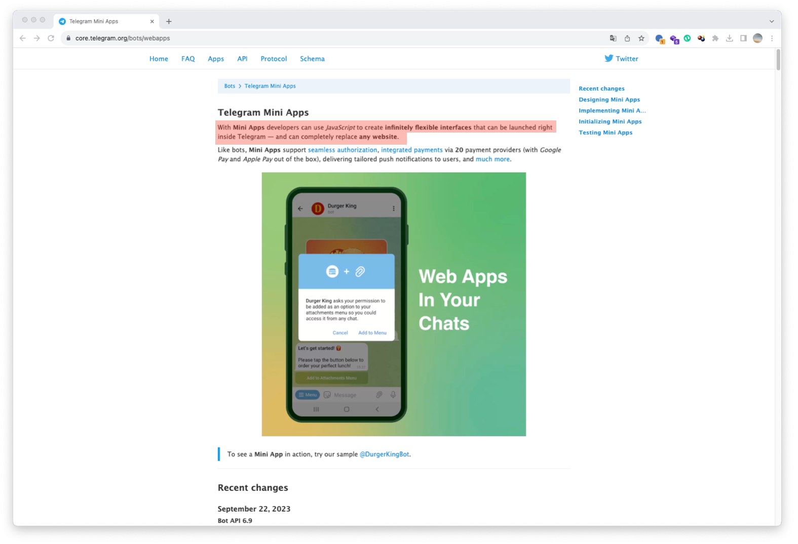 Telegram 宣布为其开发者提供了一项“能够在其中运行迷你应用”的新功能( 迷你应用即 Mini App,下文中以“小程序”代替)。