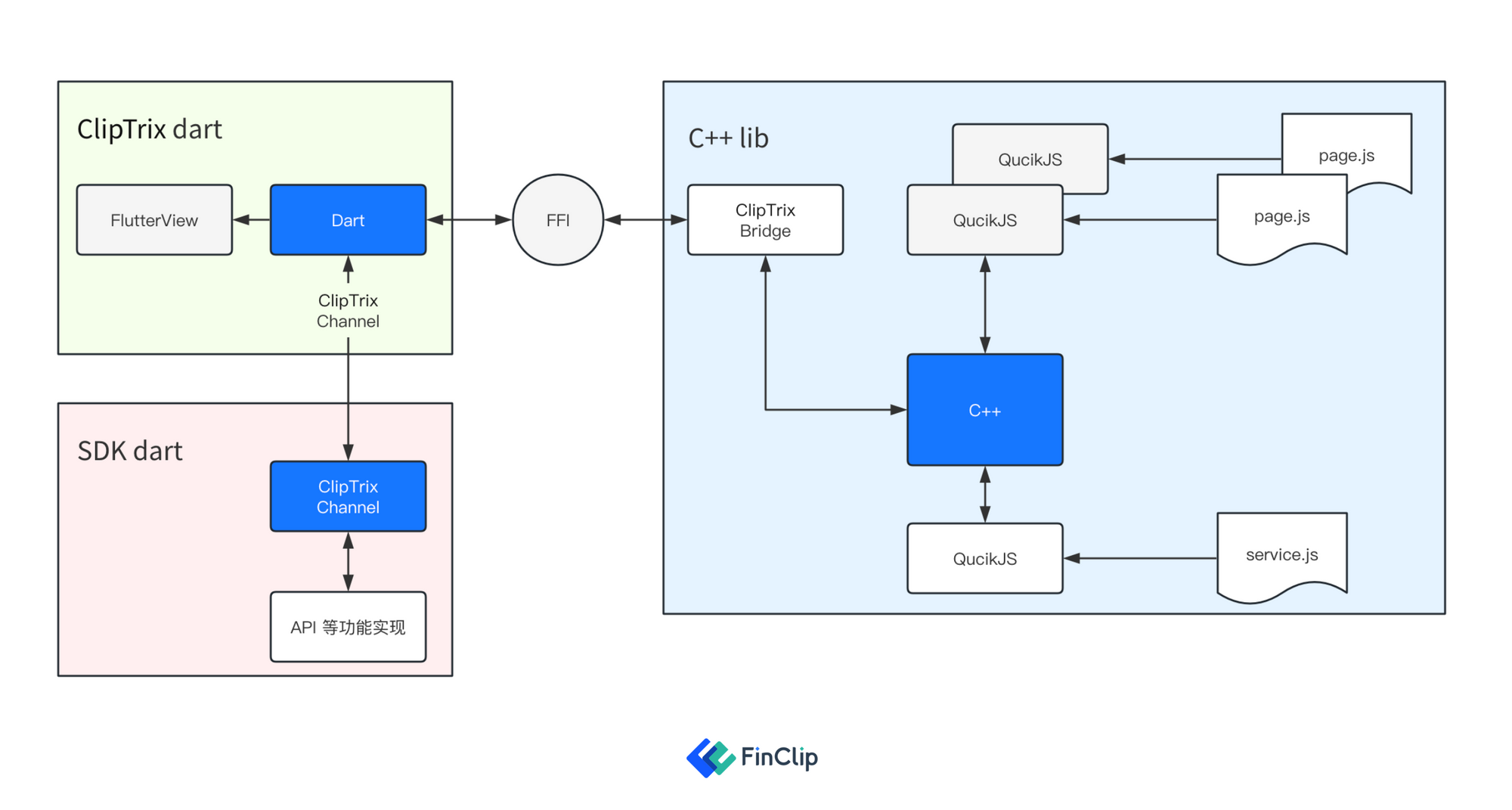 小程序的逻辑层与视图层没有较大变化,原本的逻辑层与视图层分别由 JSCore 或 WebView 分别负责,在 Cliptrix 引擎中则分别由 QuickJS 实例负责,二者之间的通讯事件则通过 C++ 进行转发。一些对应的事件(如 ServiceReady 或 API )也会发送至 Cliptrix dart进行应用层处理,C++ 与 dart 的通讯则通过外部函数接口 FFI(Foreign Function Interface)高效进行。