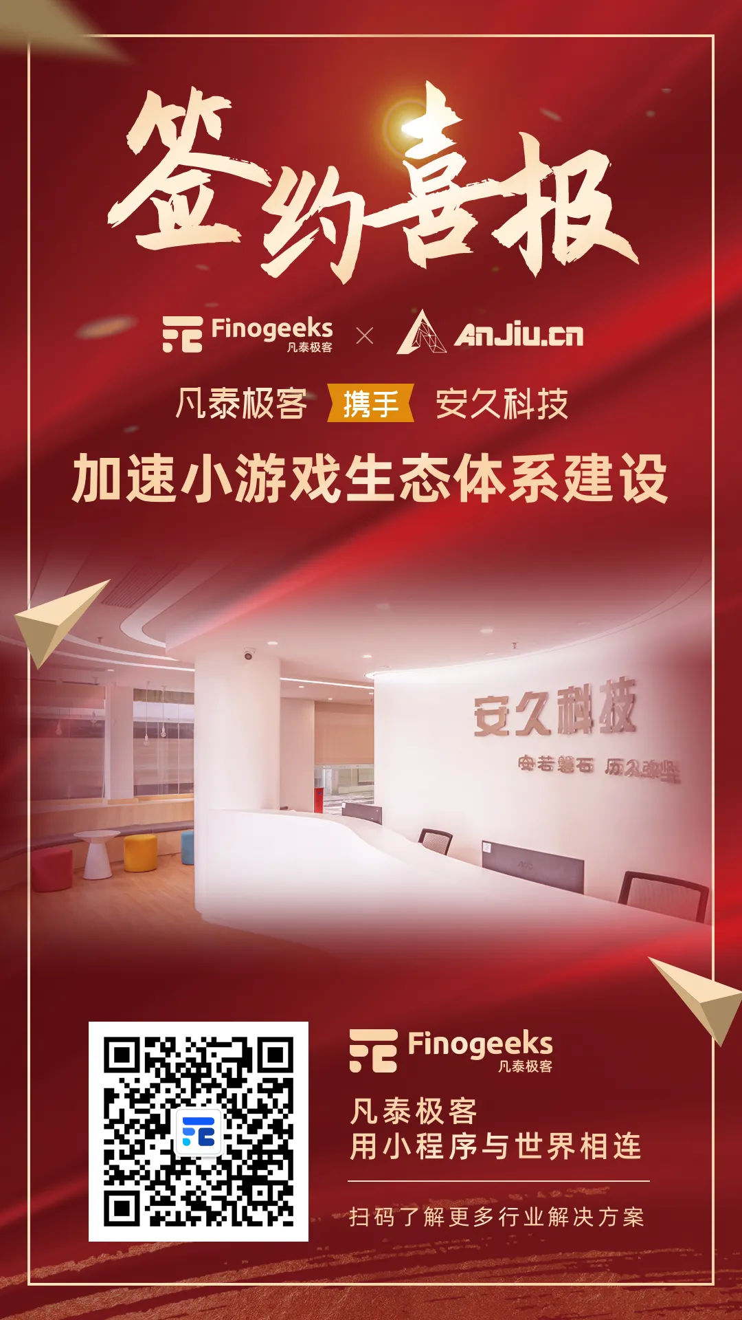 为了更好地提供手机游戏一站式服务,近日,深圳凡泰极客科技有限责任公司(以下简称“凡泰极客”)与广东安久科技有限公司正式签约。双方将基于凡泰极客旗下核心产品FinClip技术,落地小游戏生态体系建设,助力安久科技成为行业认可、玩家信任的游戏平台。