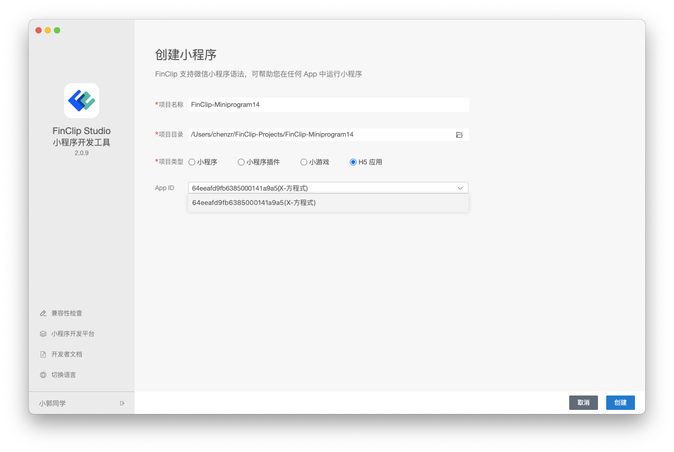 具体 H5 应用管理功能的使用方法如下:在企业端创建小程序时,用户可选择小程序类型为 H5 应用。在小程序创建完成后,用户可以在开发者工具( FinClip Studio )里,创建 H5 应用项目并关联相应的 App ID。