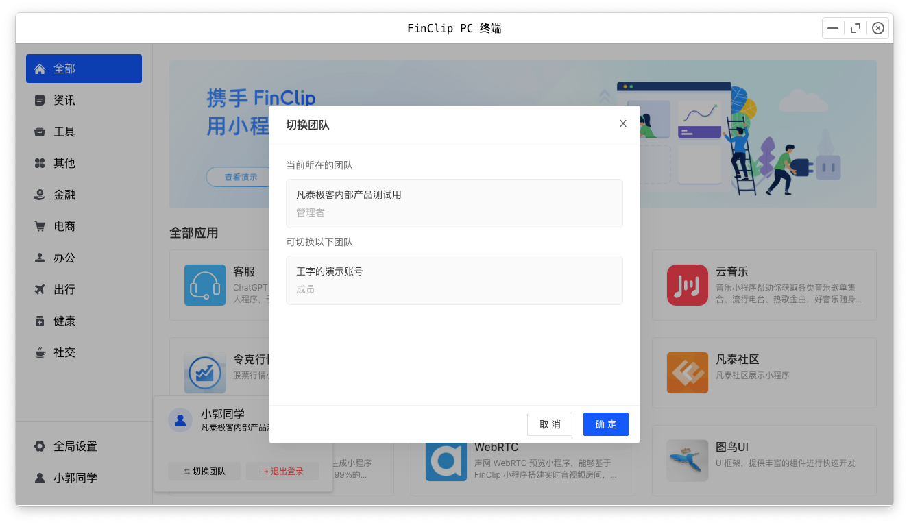 自 6月正式发布以来,我们研发团队对 FinClip PC 终端做了全面升级:通过预创建小程序进程的方式提升小程序打开速度;支持多组织切换登录;并对UI交互做了统一优化。欢迎大家前往 FinClip 资源下载中心下载体验!