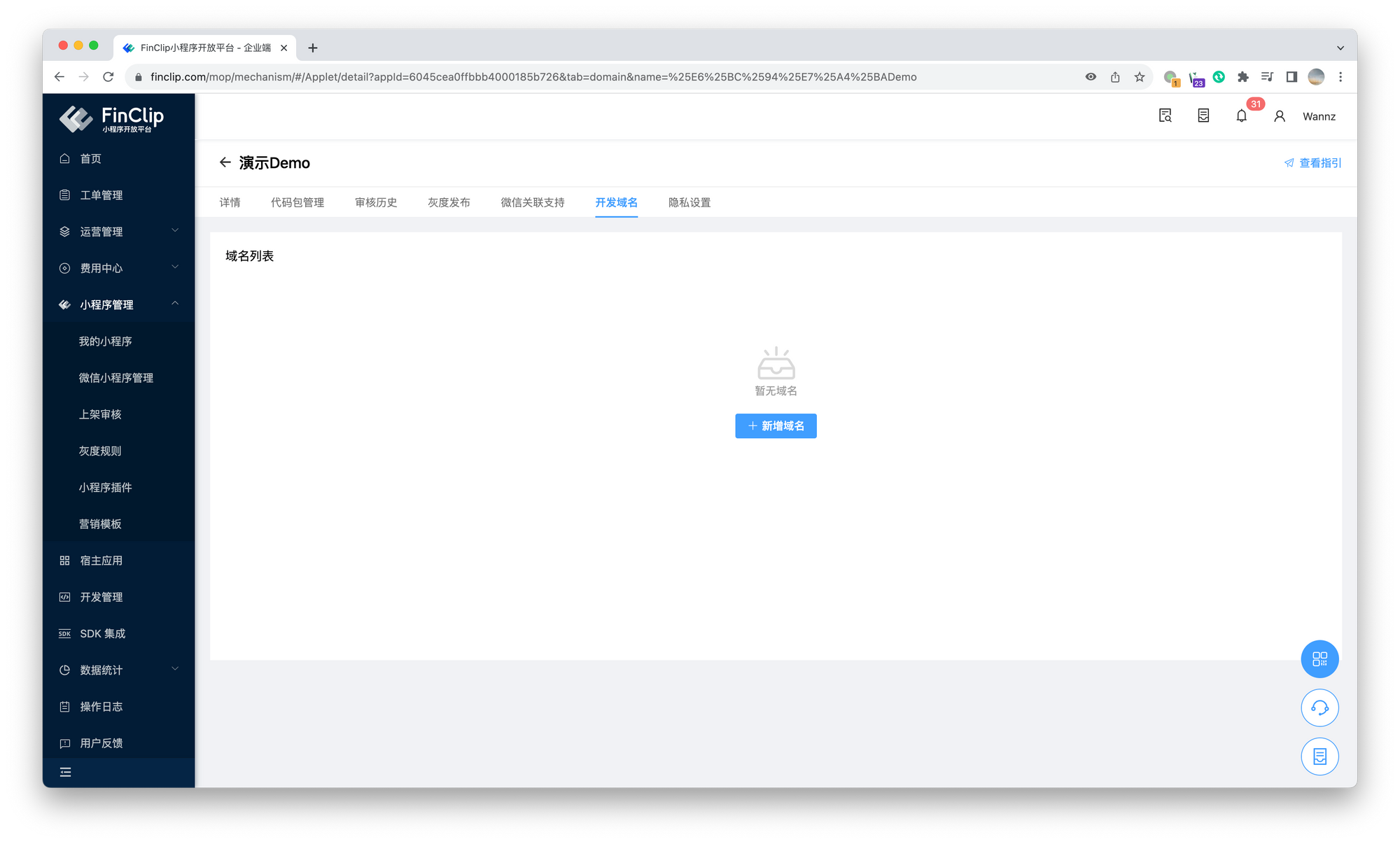 在新版本的 FinClip 产品之中,我们引入了「小程序维度」的域名配置功能。您可以针对每一个小程序独立配置需要访问的业务与服务器域名,助力您的高效开发与实现。