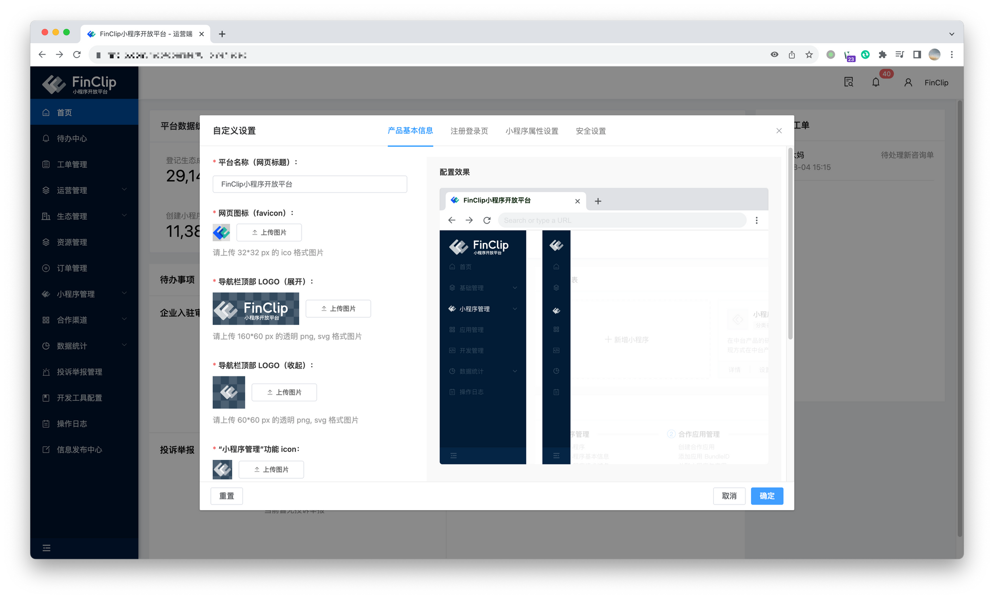 在 FinClip 的私有化版本中,我们已经全部支持用户对于 FinClip 产品后台中的所有“FinClip”字样与 logo 进行自定义配置。购买了私有化版本的用户可以根据企业自有的 VI 与设计规范对产品中的品牌,标识,版权等内容进行灵活定制开发。