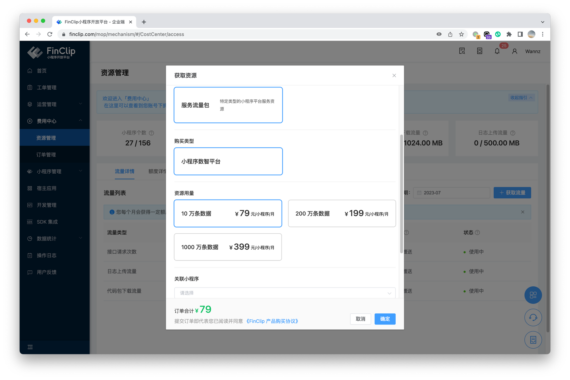 在最新版本的 FinClip SaaS 中,您可以点击左侧目录中的「费用中心 - 资源管理」获得小程序数智平台的资源流量包。