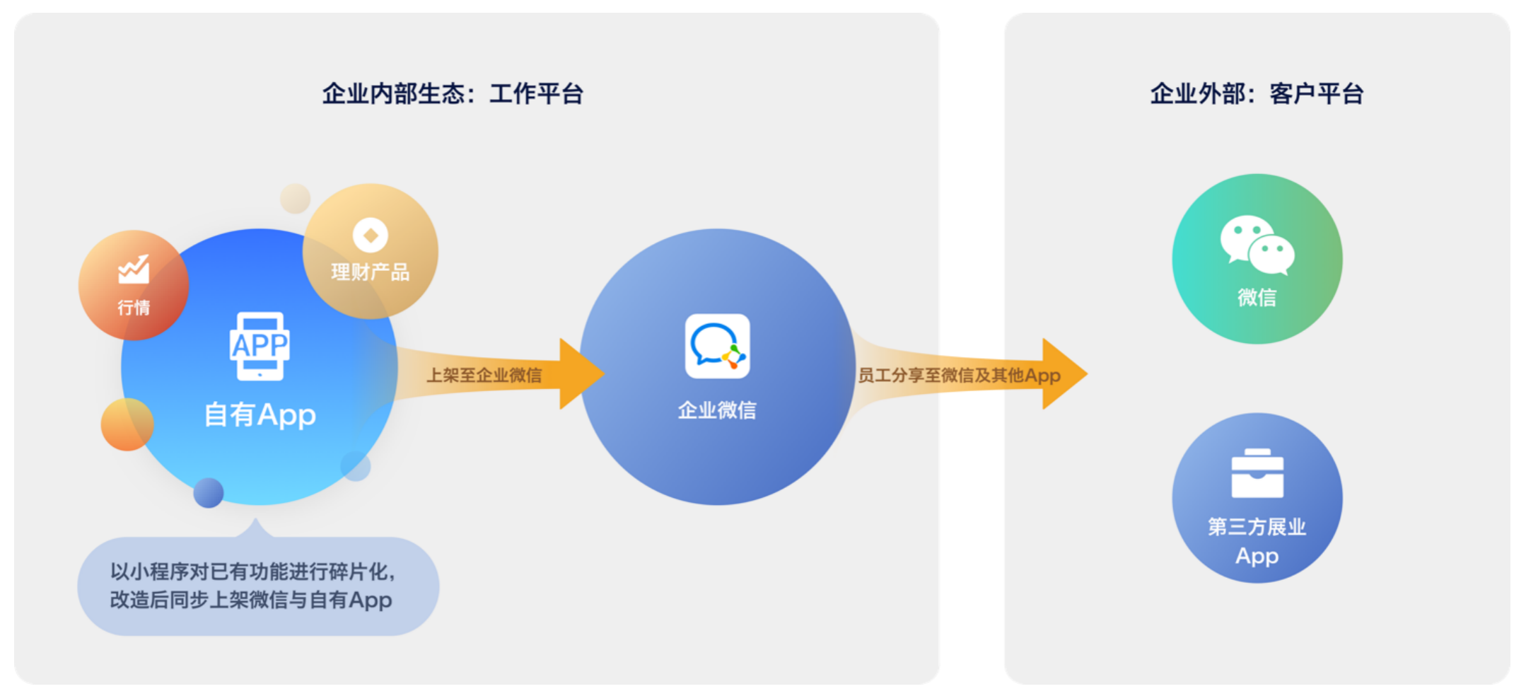 其次,各类业务功能可以小程序的形式进行改造封装,利于营销人员将各个小程序投放至外部流量平台(微信、头条、百度、抖音等),借助社交平台去中心化流量分发原则,通过小程序内容触达全平台的股民,并通过数据埋点,获取用户信息,与内部数据进行匹配并营销。