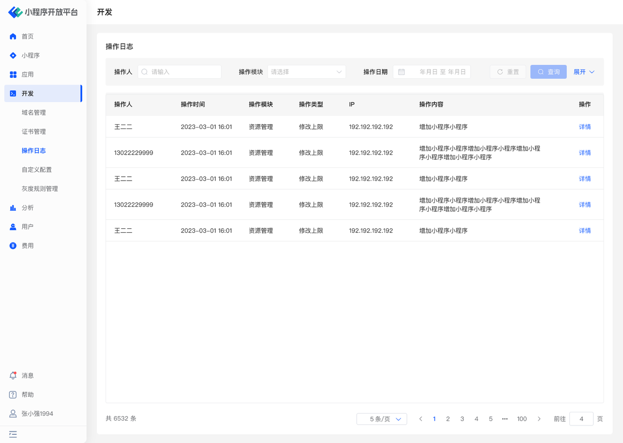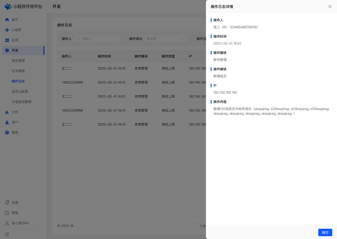 举例:如小 A 在「小程序管理」模块里新建了小程序,则操作人:小 A,操作模块:小程序管理,操作类型:新建小程序