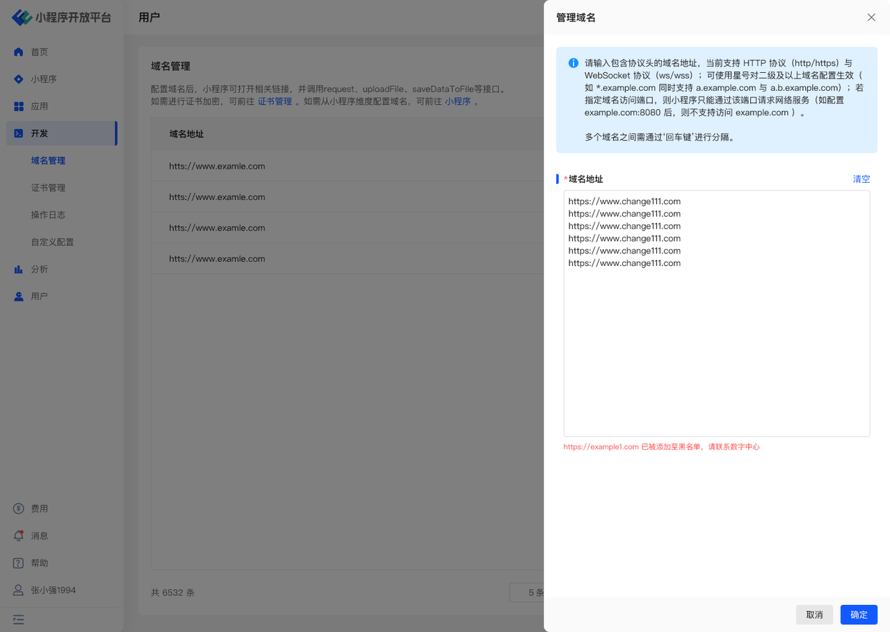 - 配置以组织为维度的域名:对所有小程序生效。如需配置以小程序为维度的域名须前往「小程序管理」
