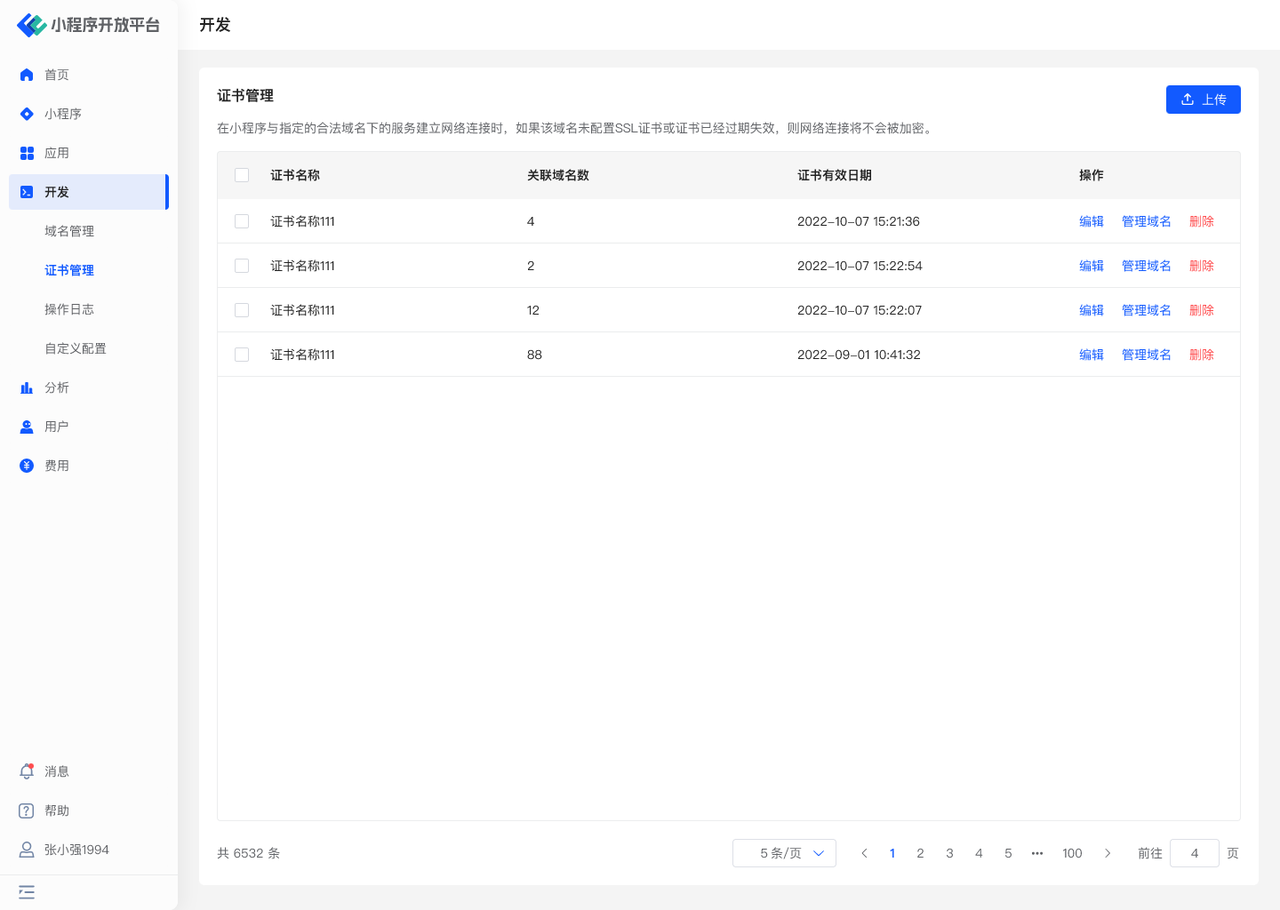 - 管理证书:上传新证书,编辑证书的名称,删除证书