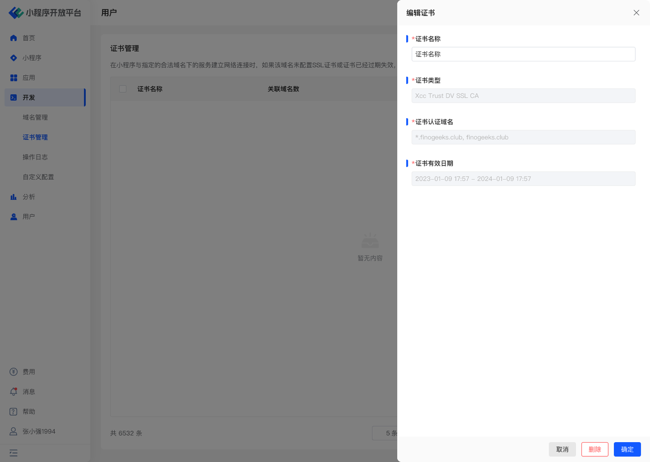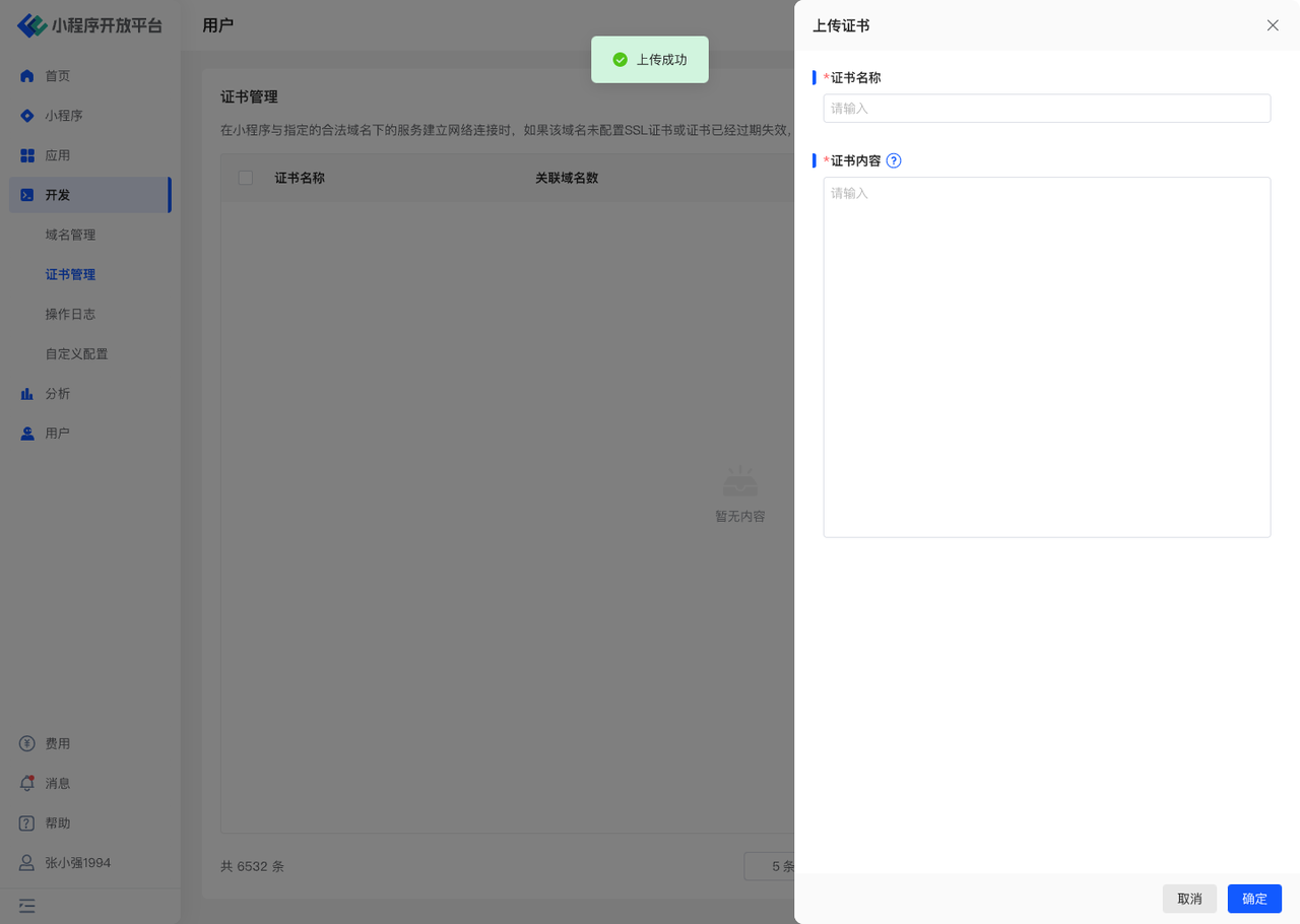 - 其中证书名称可修改,证书内容一旦上传即固定不可改。