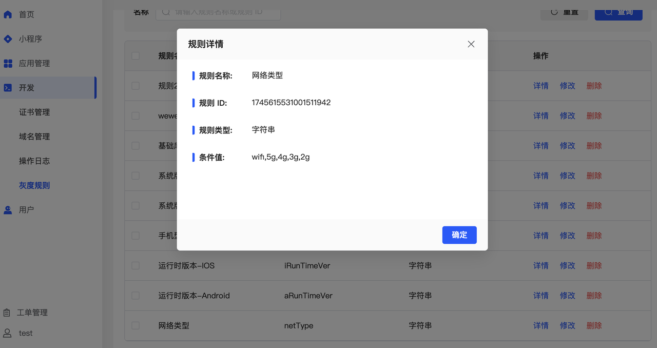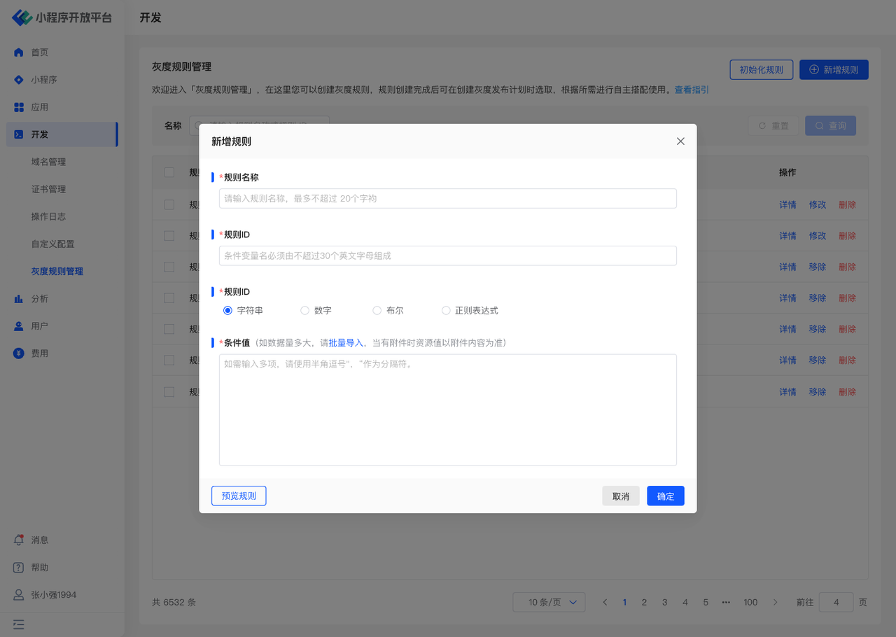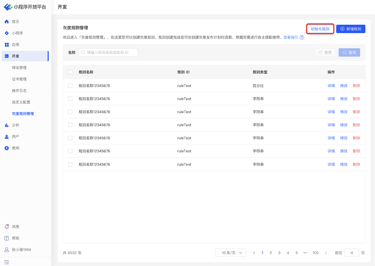 首次进入规则配置页面时,需要点击右上角「初始化规则」按钮,在当前账户中导入对应的灰度规则。我们为您提供了「基础库,系统版本,小程序 SDK」等一些默认规则,便于您使用灰度发布功能。规则导入后您即可对已有的小程序规则进行详细的配置与二次修改。