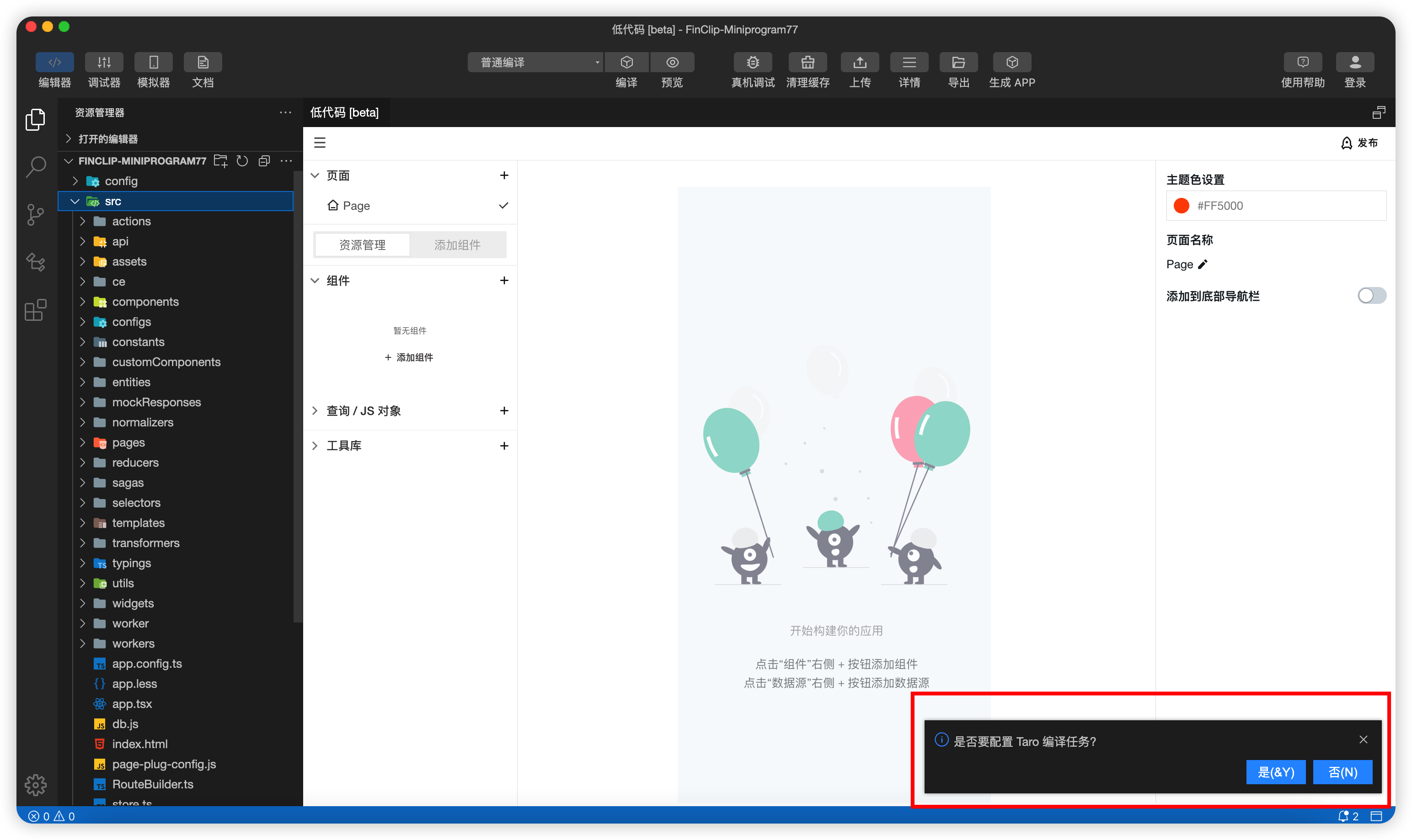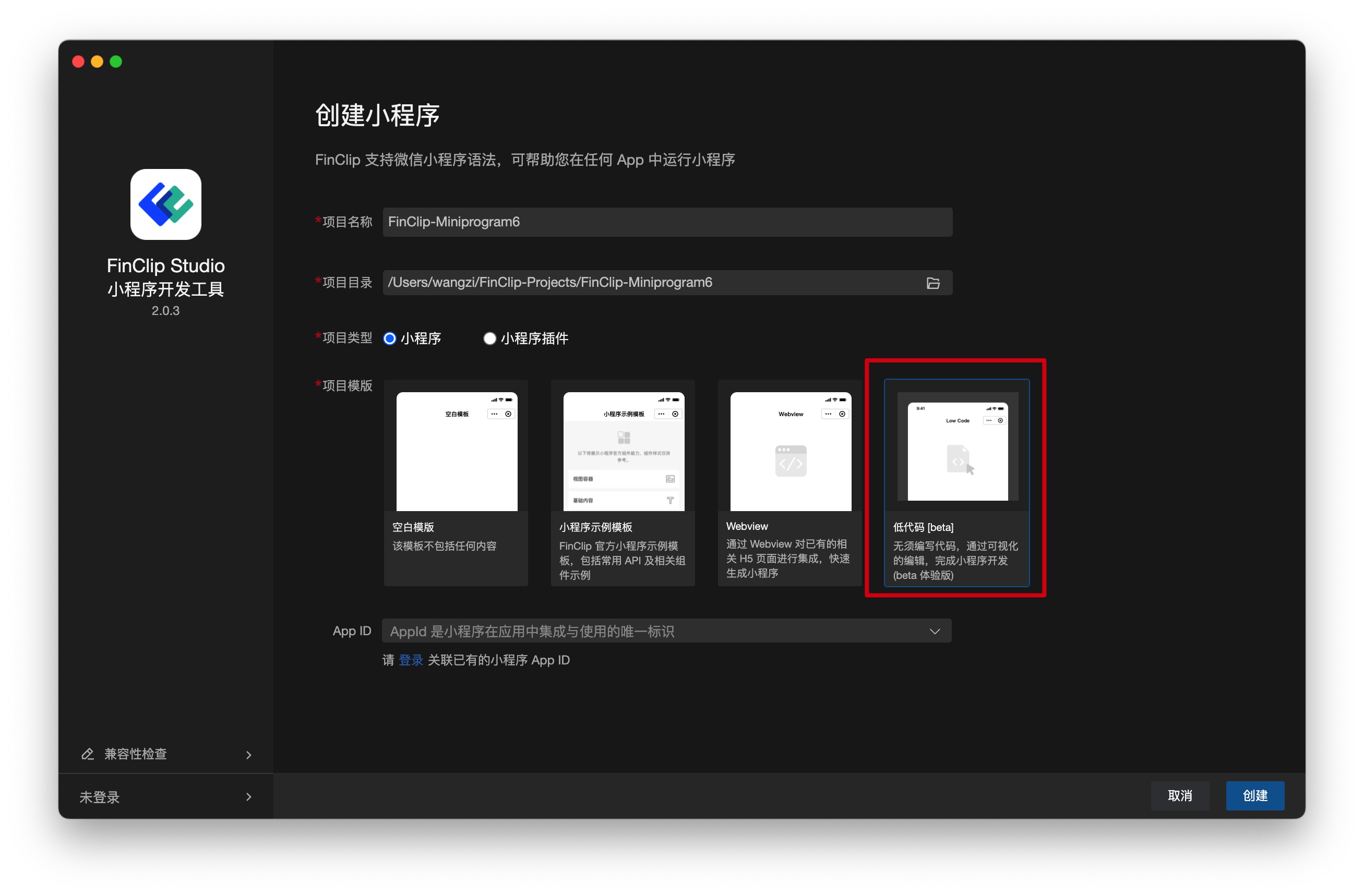 打开 Finclip Studio 后,选择项目类型为小程序,勾选低代码,点击创建,即可通过拖拉拽方式绘制小程序。