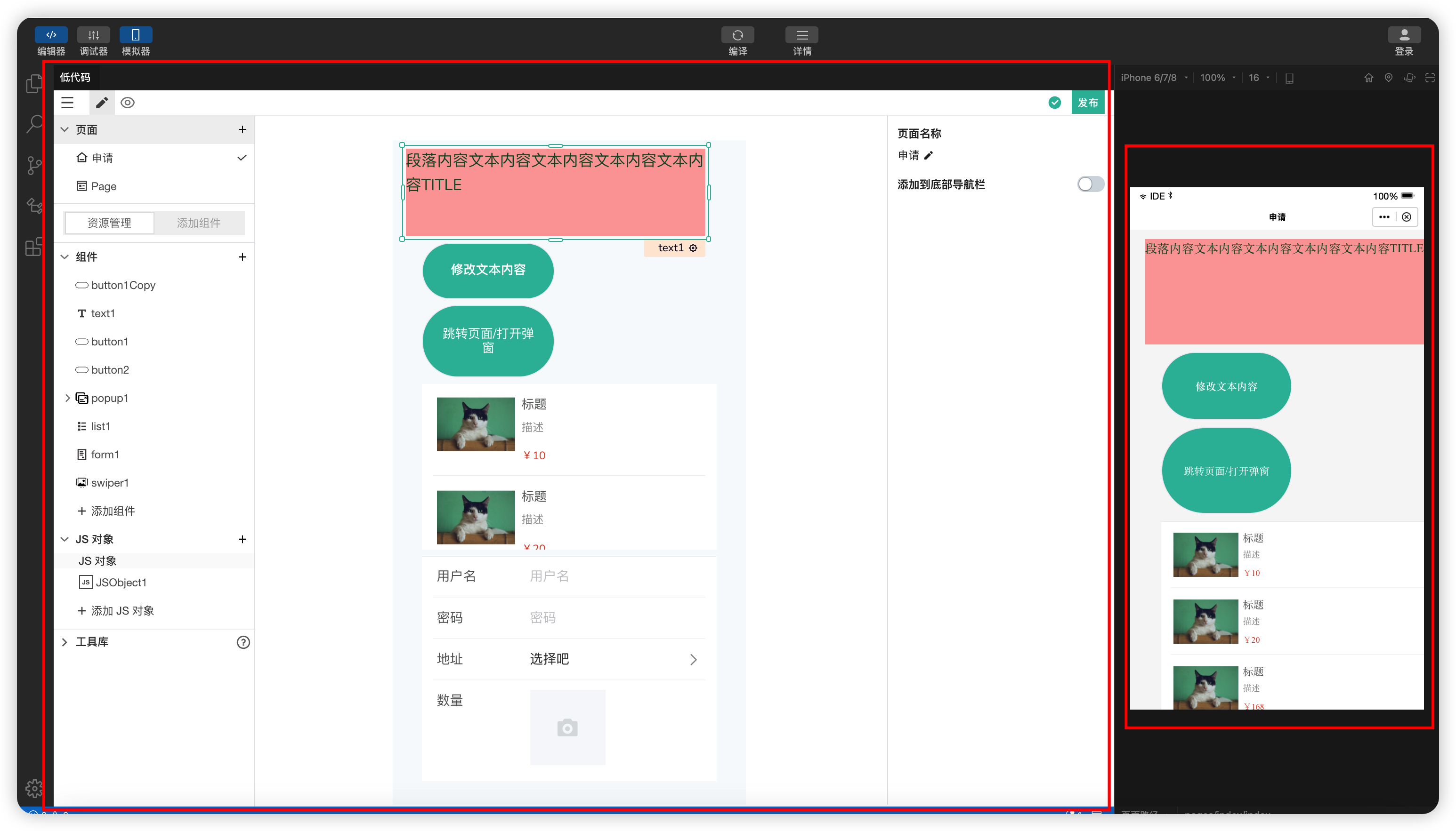 - 右侧为模拟器,点击发布会自动打开模拟器,并将左侧绘制内容编译为小程序呈现在模拟器上