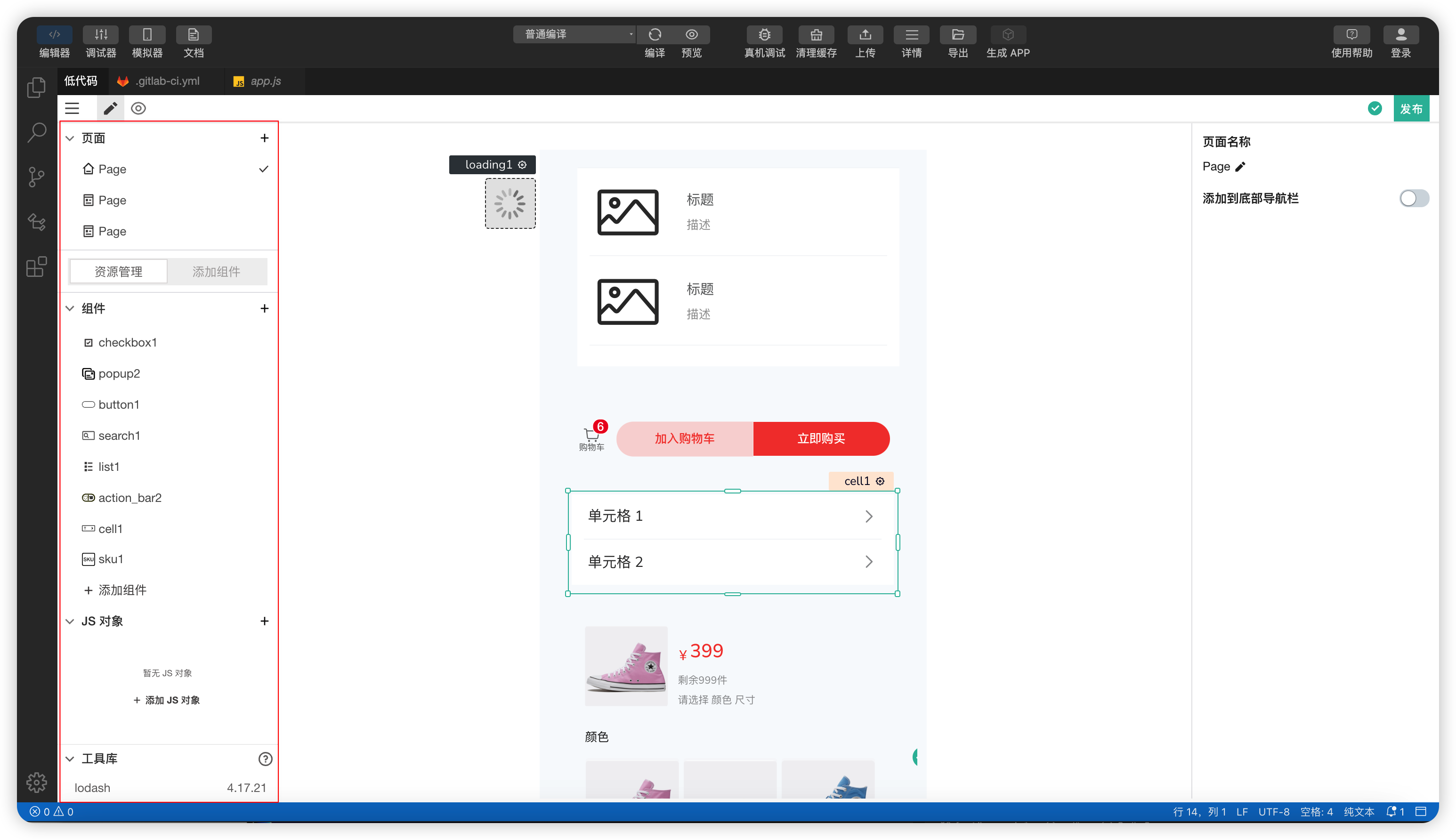 - 左侧为操作面板,用于页面和组件的绘制,以及组件的相关配置