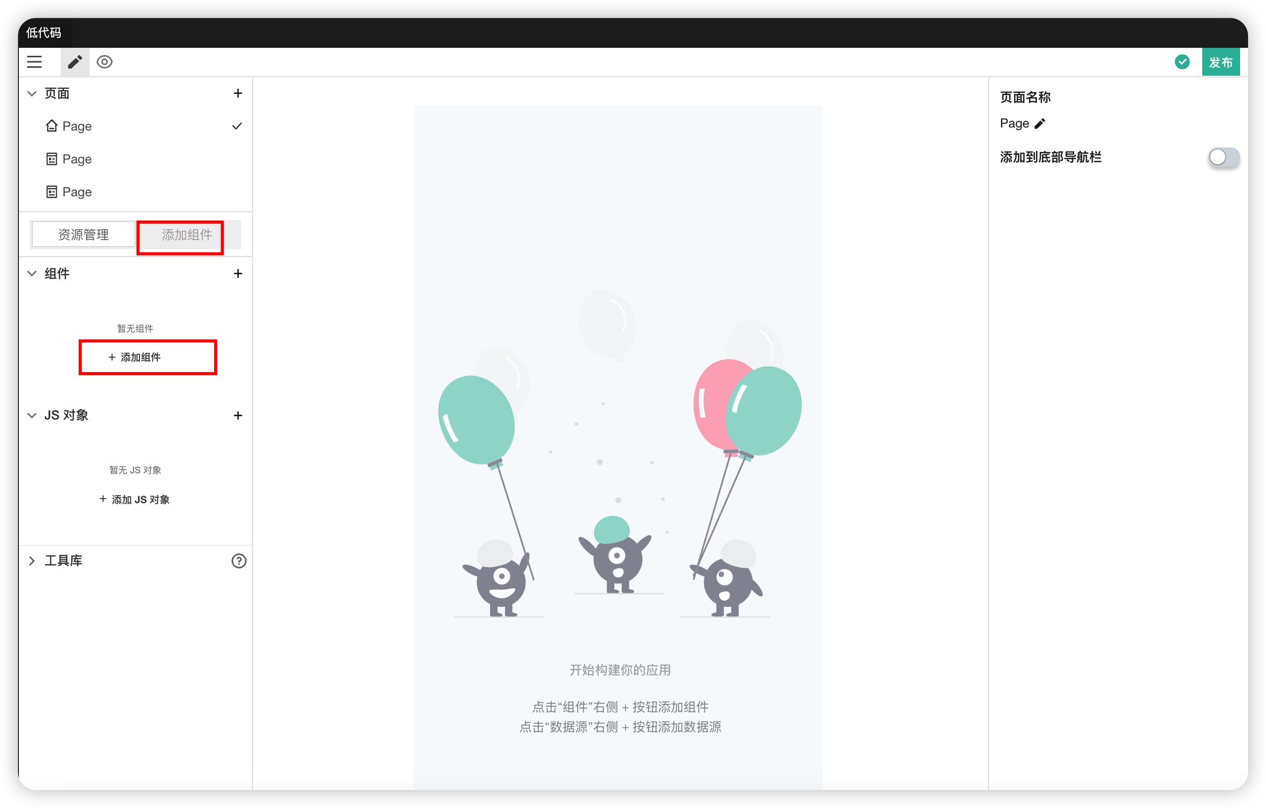 点击添加组件,将左侧组件拖拽到画布中,进行对应配置,点击右上角的【发布】,即可在模拟器中预览啦,快去试试吧!