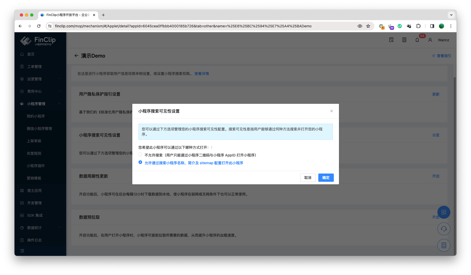 小程序名称搜索配置,则用于对用户是否能够通过小程序名称检索小程序进行配置。