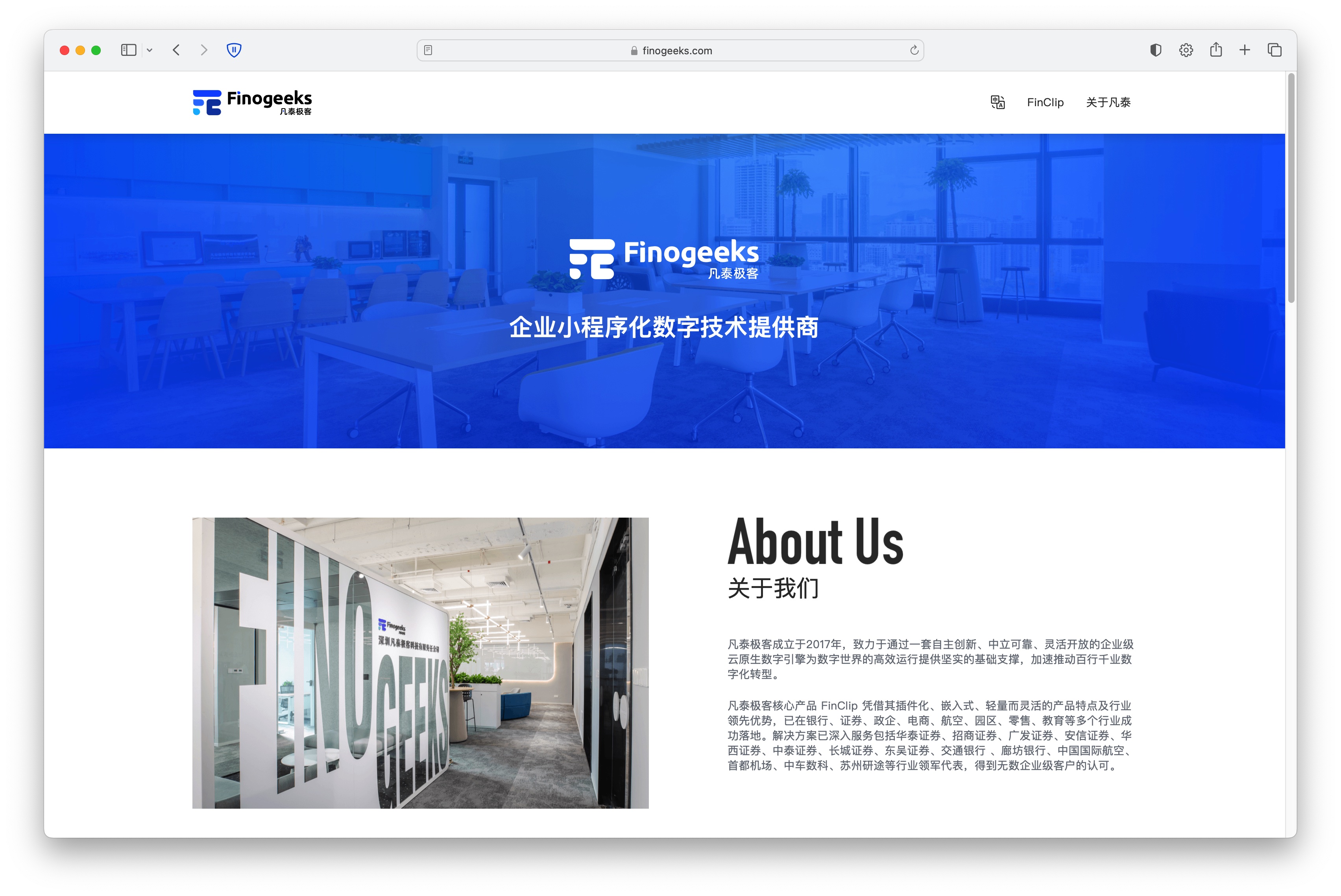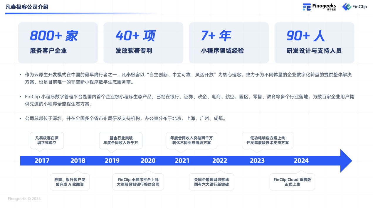 凡泰极客成立于 2017 年,作为云原生开发模式在中国的最早践行者之一,以“自主创新、中立可靠、灵活开放”为核心理念打造了国内首个“企业级小程序生态产品”,致力于为不同体量的企业数字化转型的提供整体解决方案,也是目前唯一的非垄断小程序数字生态服务商。FinClip 小程序数字管理平台是国内首个企业级小程序生态产品,已经在银行、证券、政企、电商、航空、园区、零售、教育等多个行业落地,为数百家企业用户提供先进的小程序全流程生态方案。
