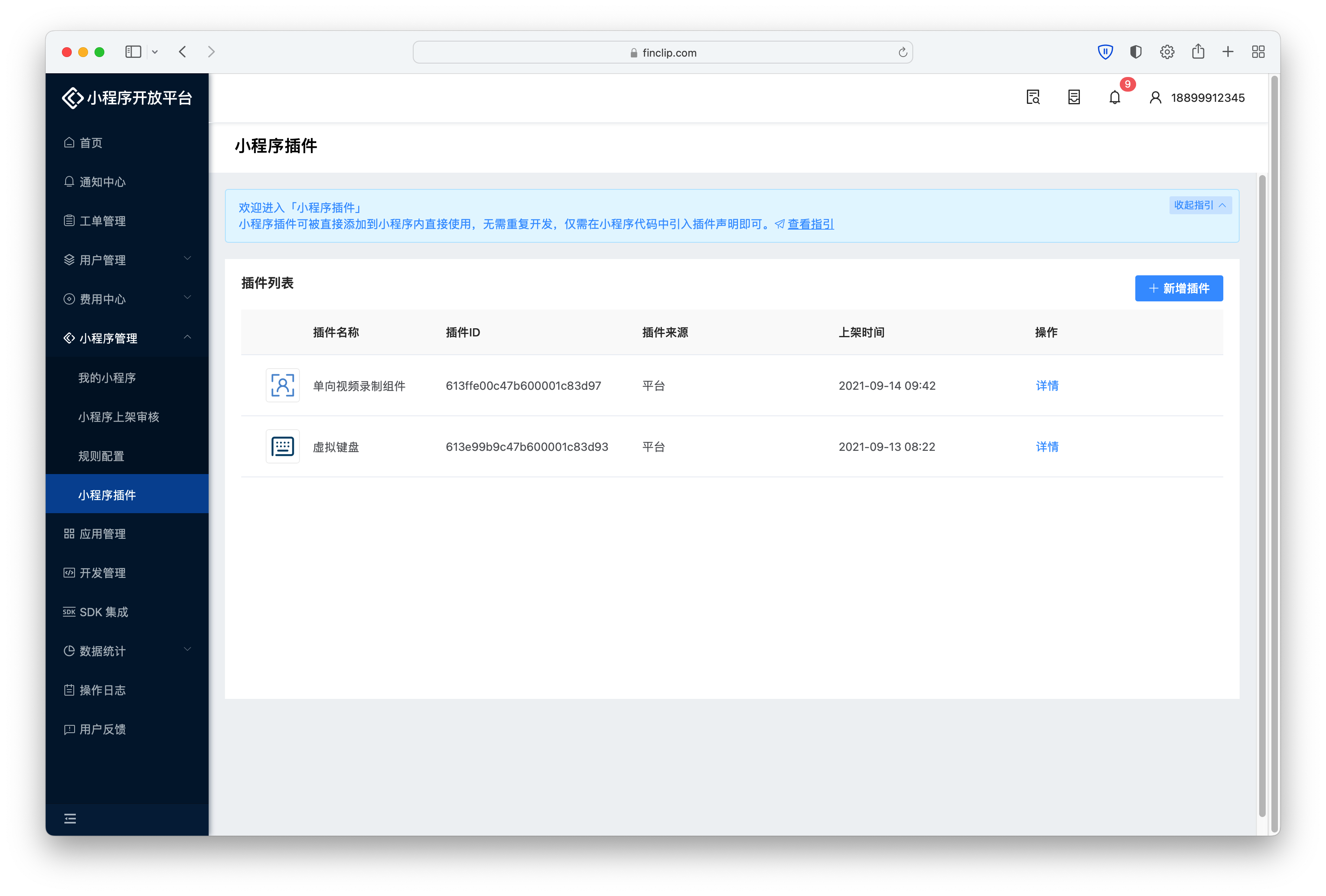信息。在 FinClip 中使用插件不需要申请,可以直接使用。