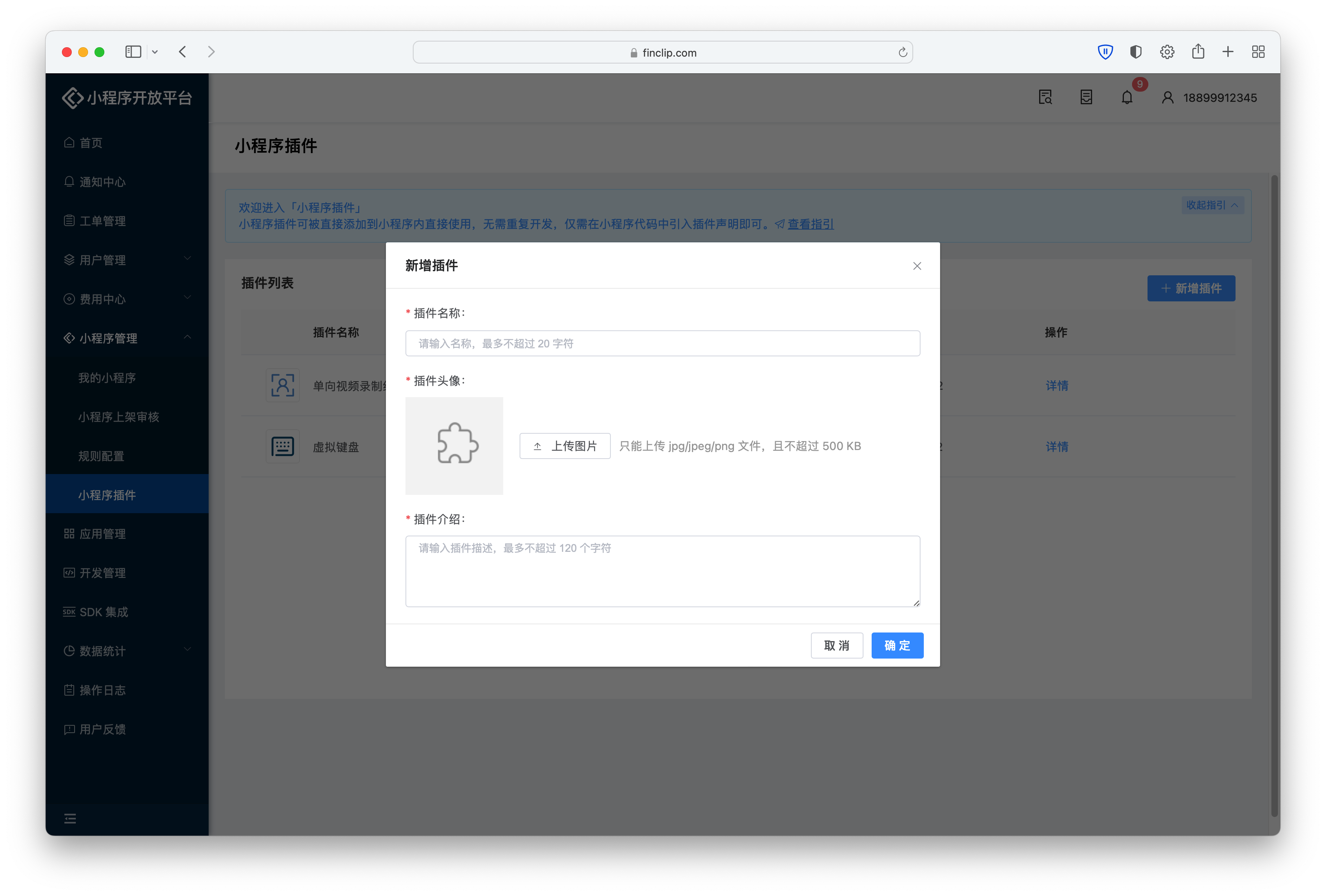 开发者如果需要上传自有插件,需要进入「小程序管理-小程序插件」页面,点击其中的「新增插件」按钮,并在其中分别输入插件名称,头像与介绍信息以完成插件新建。