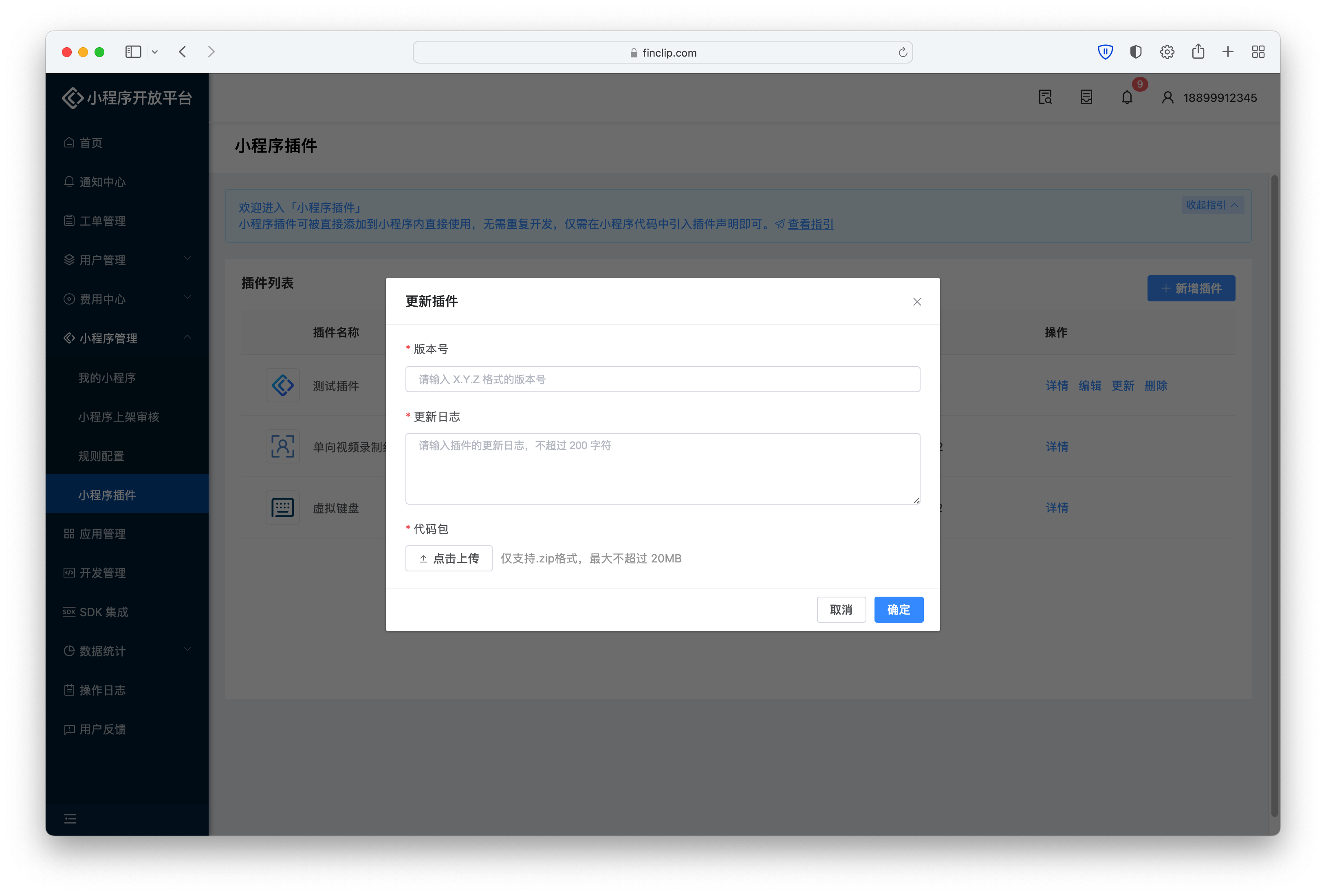 完成插件新建后,点击右侧的「更新插件」,在其中分别录入插件的版本号,更新日志,并上传代码包,就可以完成插件的上传了。