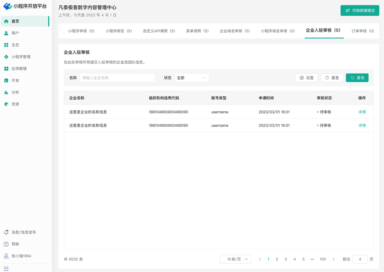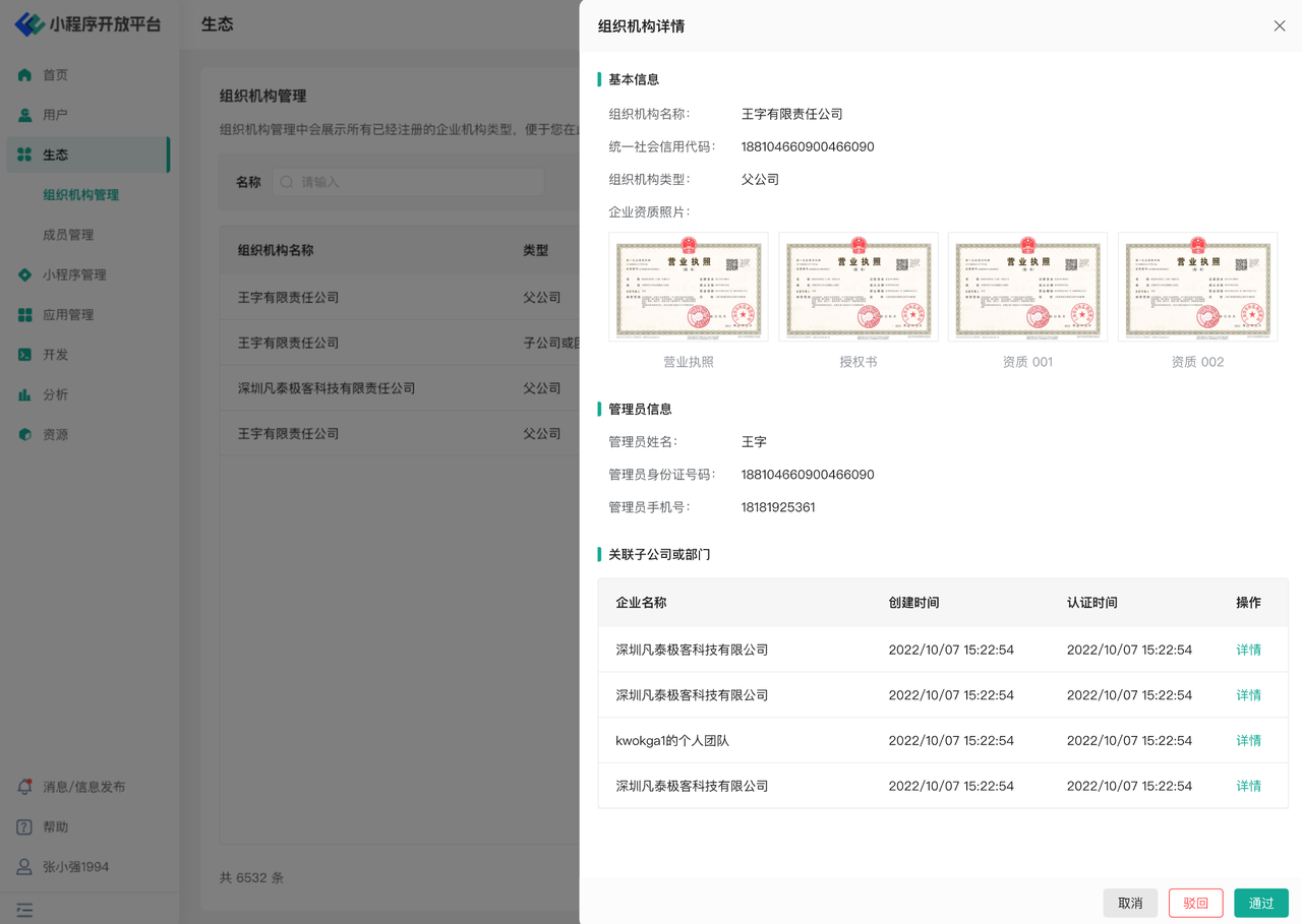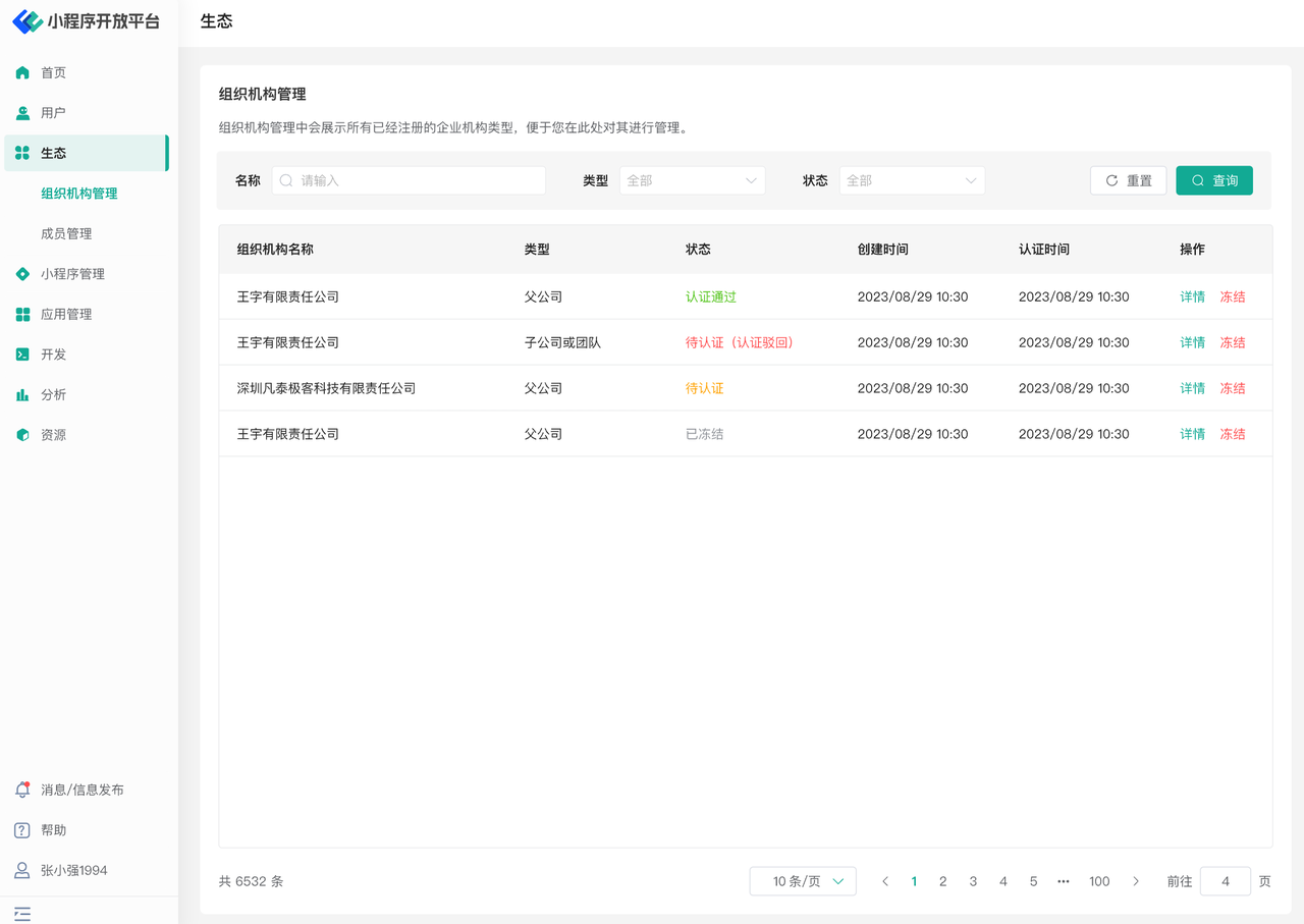 您也可以通过生态页面中的组织机构管理页查看不同企业的认证申请状态,如下图所示: