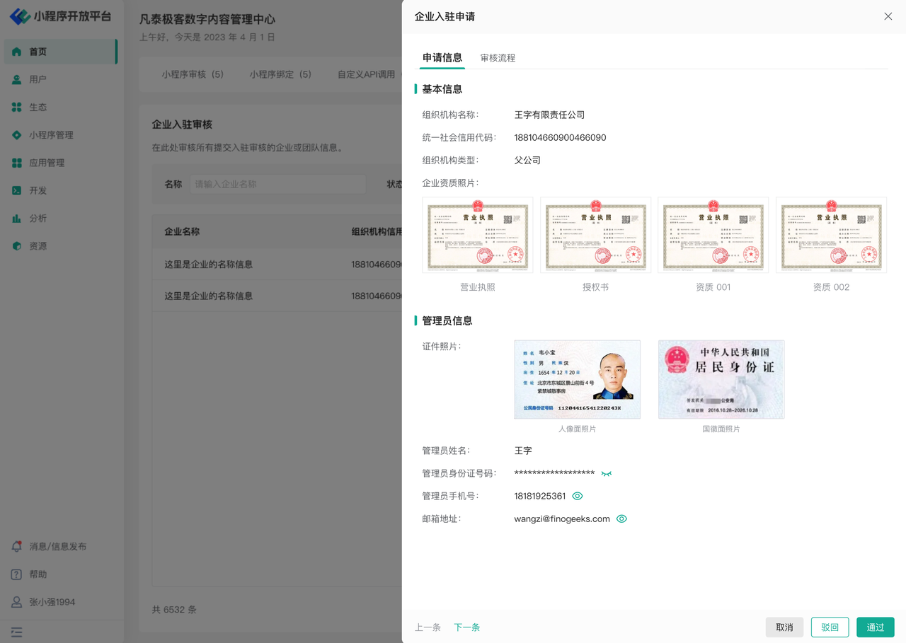对开发中心用户提交的企业认证信息进行审核操作。