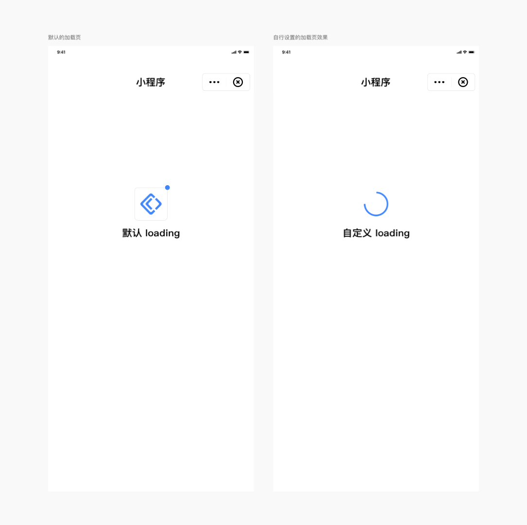 - 加载页是指:当启动小程序时,如果小程序未下载到设备,小程序容器会启动加载页提示用户等待,待小程序安装到设备上,加载页关闭并跳转至小程序。用户首次打开小程序、或小程序版本更新后,加载页停留时间会相对较长