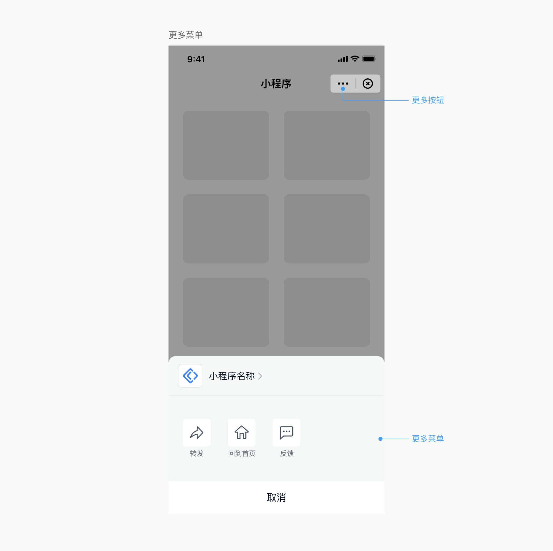 点击右上角胶囊中的“...”即可唤起如下更多菜单页面