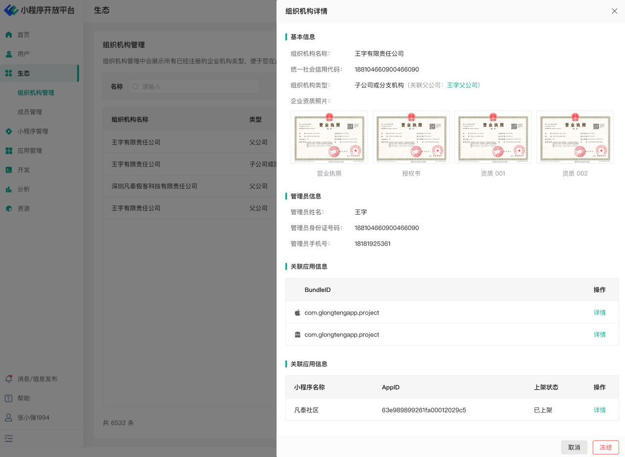 在组织机构详情页面中,还可以看到当前企业名下所有创建的宿主应用与小程序信息。