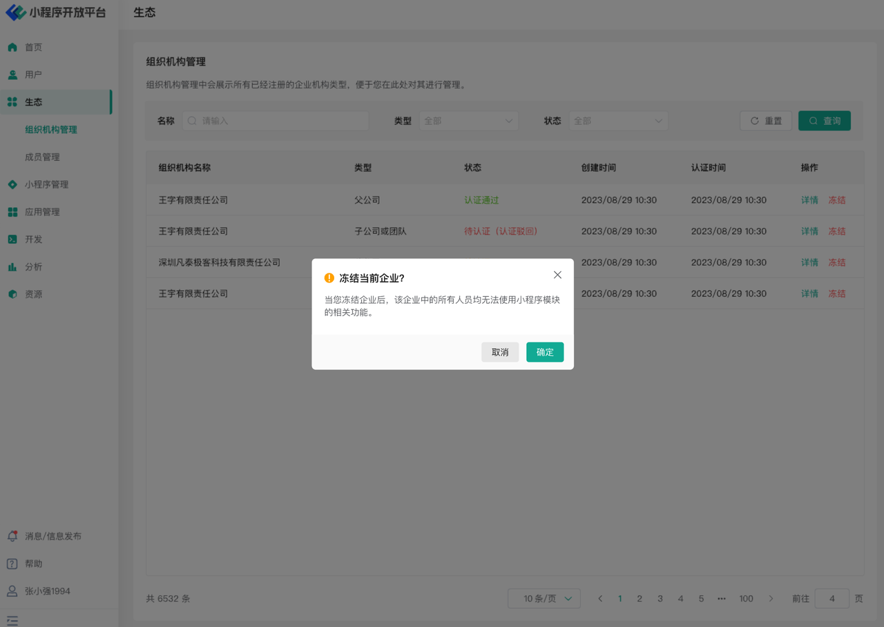 若点击冻结按钮,则可以对当前组织或机构进行“暂停”操作,冻结后当前企业中所有人员均无法再使用小程序模块或相关功能。