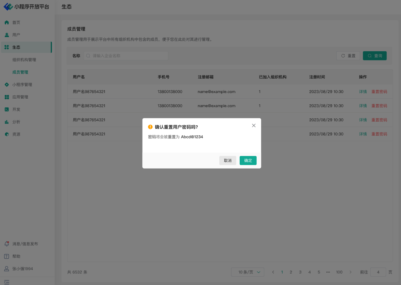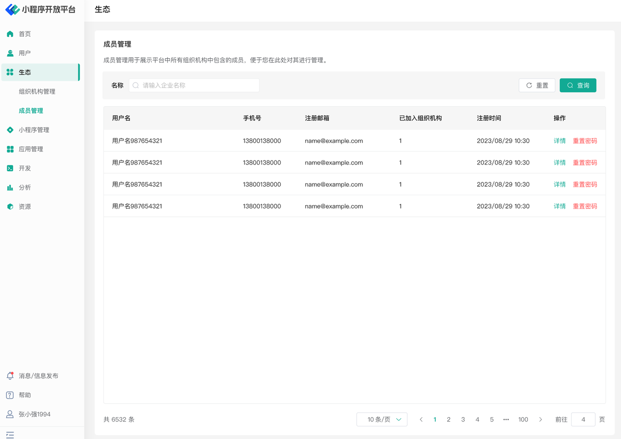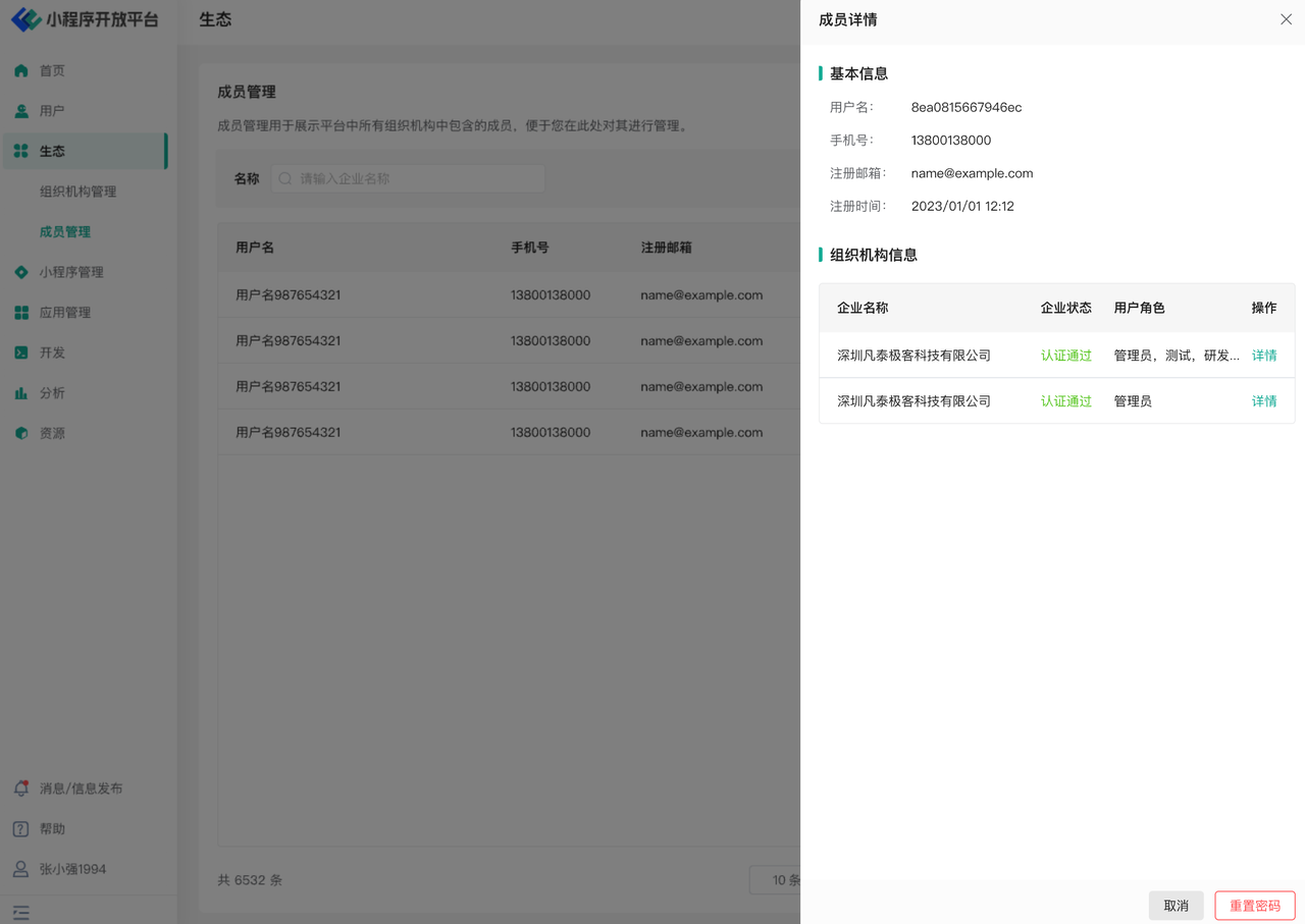 在成员管理页面中,用户可以看到当前生态平台中所有已经注册的成员信息,列表中会展示对应用户的用户名,注册手机号,注册邮箱,已经加入的组织机构,注册时间等信息。您可以点击右侧的按钮查看该用户的详情或对其进行重置密码操作。
