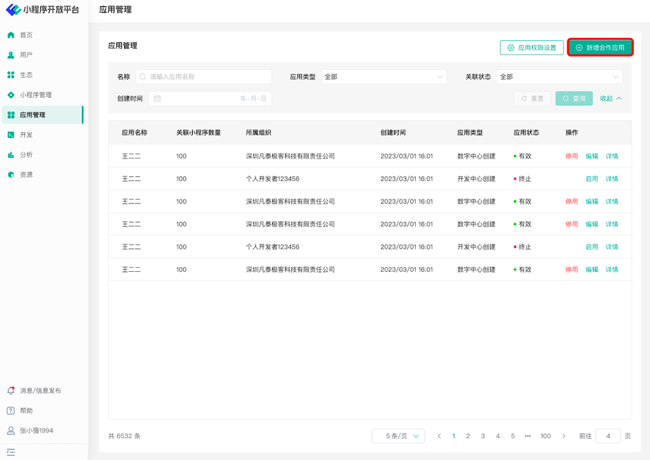 进入「应用管理」页面,点击列表上方「新增合作应用」按钮,补充对应的应用基本信息,其中: