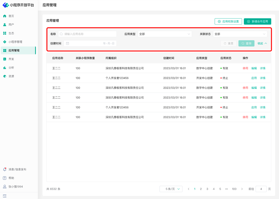 - 查看应用:查看来自数字中心、开发中心创建的应用详情