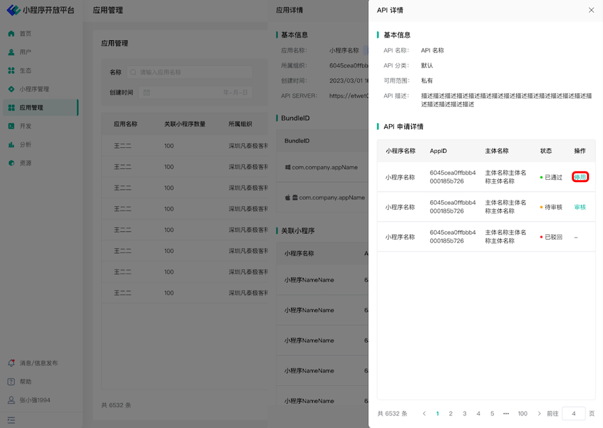 补充说明:数字中心创建的应用支持自定义创建 API、菜单并且进行相应管理,若其他应用下的小程序想要申请调用 API、菜单,可在具体 API/菜单进行审核操作(也可在待办中心进行审核)。此外,若之前已审核通过某 API/菜单,现需停止其的调用,可前往该应用-API/菜单详情,点击「停用」。