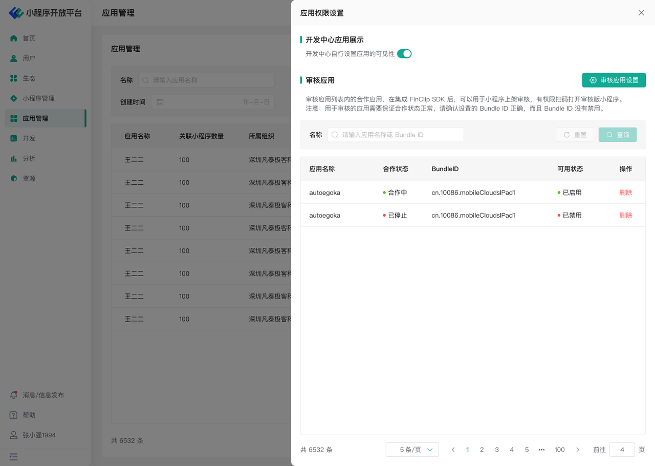 - 审核应用设置: 在这里可以选择部分数字中心创建的应用,设置为审核应用,审核应用在集成 FinClip 小程序 SDK 后,可以用于小程序上架审核,有权限扫码打开审核版小程序。用于审核的应用需要保证合作状态正常,如果需要使用审核应用,请确认设置的 Bundle ID 正确,而且 Bundle ID 没有停用。